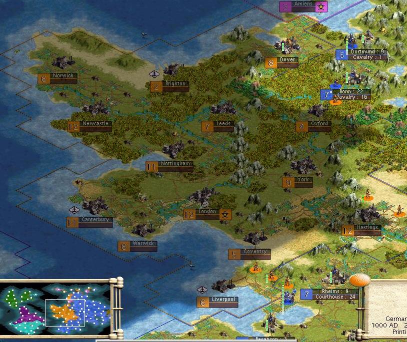 The attack force of cavalry was split into two main columns: one that can be seen next to Rheims tha targeted Liverpool and another out of view that wea after Hastings. A third small force was outside Dormund to take Dover and give me control of the region north of the jungle. I missed by target date by one turn, and launched my attack in 1010AD.