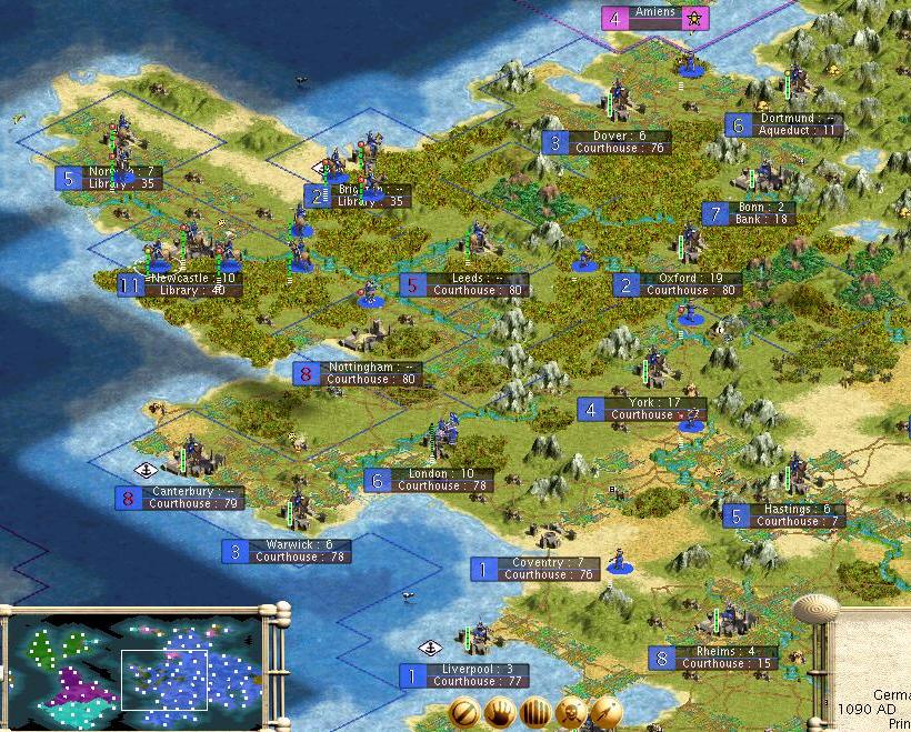 England caved under my attacks incredibly quickly, and I took all of their cities on my contient (and yes, it was MY continent by this time) in 1090AD! I signed peace with them as well for the techs that I had been neglecting while fighting wars. The extreme speed of this attack testified to the value of cavalry: speed is king in Civ3. A little map of former England, for your viewing pleasure: