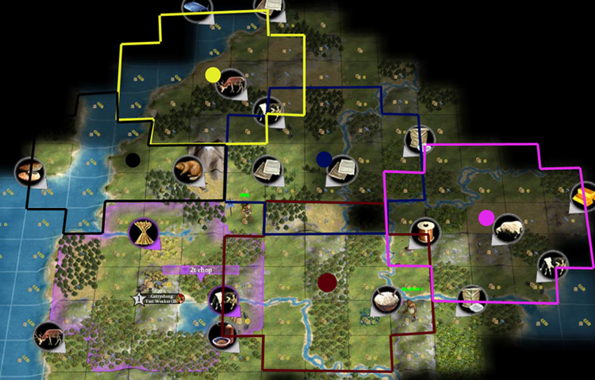 The priority order was Red, Blue, Pink - then Yellow and Black later on. These cities would mutually support one another from a defensive perspective, all had at least one food bonus if not two, and possessed many yummy grassland river tiles for Financial cottages. If we could land these cities quickly to form our civ's core, we figured to be in pretty good shape.