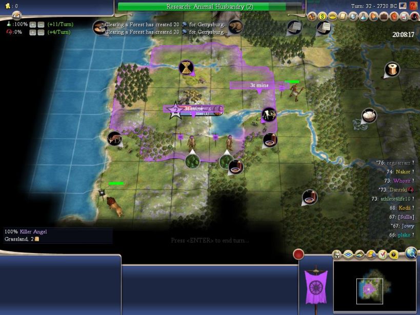 At this point, we had two cities, two workers, three warriors, and two improved food bonus tiles. We were the first team in the game to found a second city, and as best I can tell from reading the other spoiler threads now after the game's conclusion, we were the only team with two workers. (Remember, most everyone else started on the coast and went for a work boat at some point.) Jowy had the misfortune to lose a scout and his first warrior to barbarians, and had to slow his development further to train replacement warriors. Dantski had teched Hunting and Archery, and was training a few skirmishers for some reason. (Impregnable defense in cities, but a slow start from a growth perspective.) We had Bronze Working and Animal Husbandry techs, with both copper and horses visibile and in range of our current cities. Our two neighbors were friendly and showing no intention of acting aggressively towards us.