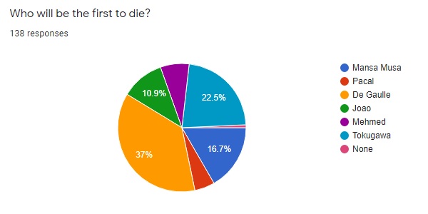 The community predictions were heavily behind Mansa Musa and Pacal for this game. About 90% of the contest entrants had one of the game's two Financial leaders taking home the top prize. The second place category was the hardest to predict as usual, with everyone other than De Gaulle chosen by a representative sample of participants. The one category that De Gaulle topped was the ignominious First to Die selection, as the group largely didn't think much about his chances in this match. We also ended up with a Spaceship-heavy series of choices for the victory condition due to the presence of the strong economic leaders in Mansa and Pacal along with relatively weaker militaristic competitors.