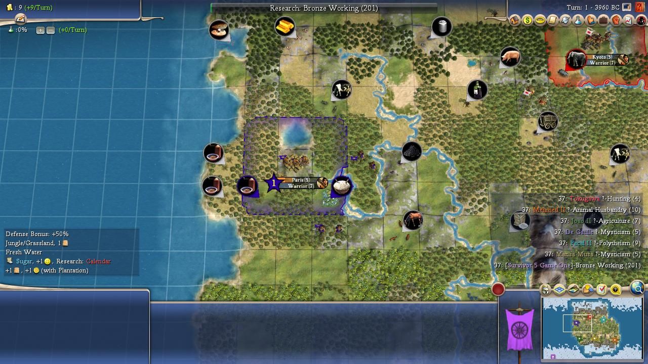 MirrorG: Ahh, it's good to be back! Wasn't able to play for most of season 4, so it'll be nice to be able to work on my guessing game all season 5! As for my pics, Mansa is always strong, but he's being matched against several low peace weight + economic + militaristic opponents. I suspect that unless he can take out Joao without much difficulty he'll end up penned in by a bloc of Pacal, Mehmed, and maybe de Gaulle, of which Pacal's economy will snowball the quickest and allow him a relatively speedy victory. As much as I loved his performance last season, Tokugawa is royally screwed by being sandwiched between two warmongers from the start, especially with his reluctance to make friends, so he'll be out first.