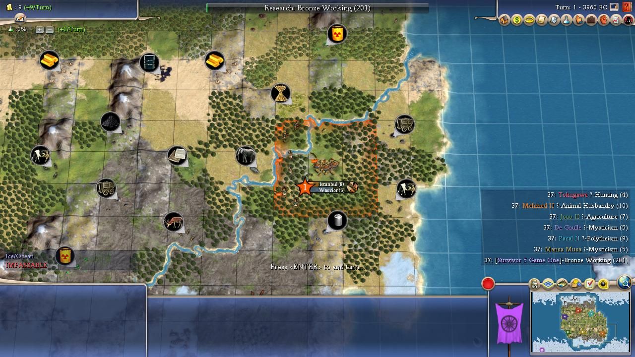 c0lors: The cold map should constrain the settlement phase and get the wars started faster. I see Mansa taking a beating early, but I don't think the AIs will be able to close the deal and land the killing blow on Mali. I am very tempted to go with peace weight and pick Mehmed or Pacal, but I also don't want to feel like an idiot when Mansa rides his starting gold and river valley to an insurmountable tech lead. Pacal looks less attractive because Japan is right next door and the land to his south is dry and will be heavily contested by the Ottomans. Anyway, I'm guessing the king stays the king, and Joao rides Mansa's coattails to a comfy second place.