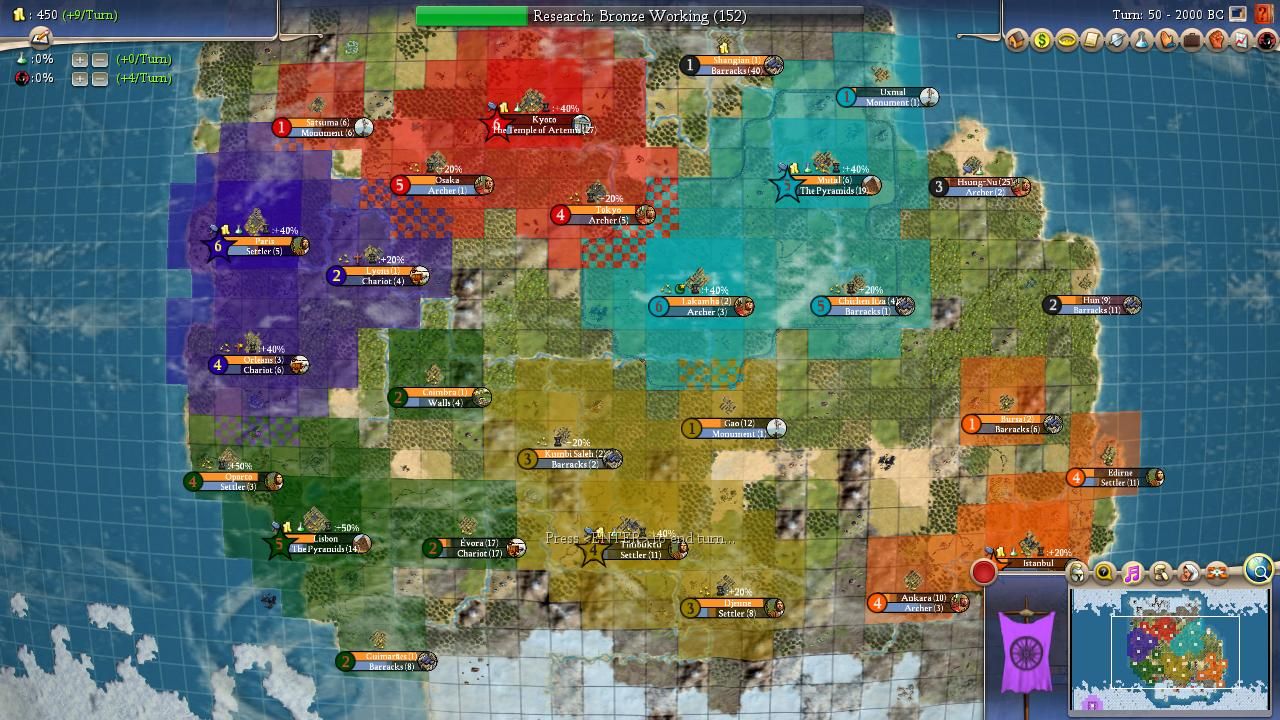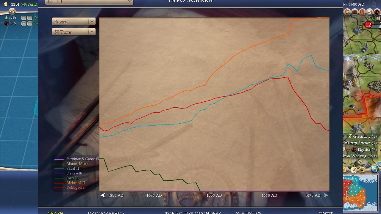Instead, De Gaulle would sneak out a series of settlers through the narrow open corridor running along the western coast. He was ultimately able to grab copper up there and follow the initial city with several additional ones in the extreme north, icy fishing villages that were pretty decent contributors thanks to having seafood resources on hand. This kept De Gaulle from being a helpless metal-less leader who had no chance to survive. Meanwhile, the push of so many leaders to settle westwards had left additional open territory off to the east. Several barbarian cities sprang up there without doing too much to slow down the AI leaders, largely because the barb settlements failed to appear on hill tiles and could be captured much more easily. The winners of this development were Pacal and Mehmed, both of whom were able to expand into unclaimed territory long after the other leaders were out of space. Mehmed in particular had a slow start but took advantage of the extra land, eventually capturing the barb city of Hun and racing out to eight cities in total. Pacal grabbed the other two barbarian cities to pair along with his strong economy. Even losing out on a Pyramids race to Joao by a single turn didn't seem to be hurting the Mayans too badly.