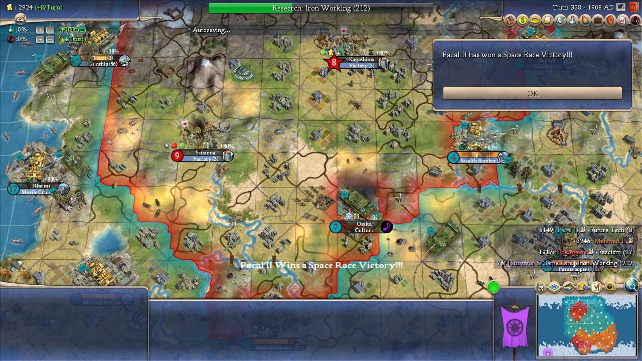 Thus the main significance of Mehmed's intervention was to send Tokugawa into the Wildcard game. (That and ticking the war declaration counter from 10 up to 11, disappointing all of us who had predicted an even ten wars!) Pacal was likely about a dozen turns away from triggering a Domination victory instead, and he would have gotten a lot closer if he finished off the huge pocket of Japanese culture clinging to life in the north. Pacal looked like a complete runaway performer according to the scoreboard, and he was a runaway indeed when it came to technological research. He had not been nearly so far ahead just two dozen turns earlier though before capturing most of Japan and all of the Ottoman border cities. Pacal's strong position had been masked for most of the game before exploding into action (quite literally) during the closing turns of the game.