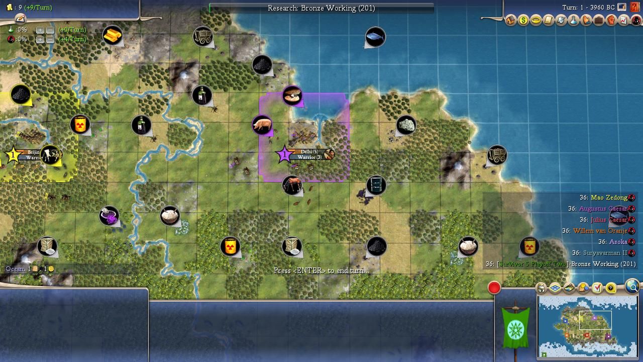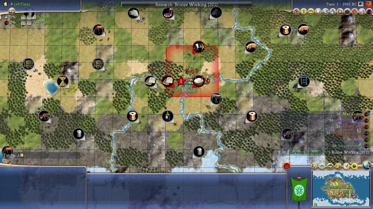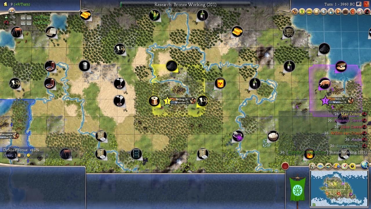 dreamyeyed: Asoka doesn't have copper and he starts close to Mao who has some right next to his capital. I doubt he'll survive long enough to get access to iron, especially if Caesar also decides to join the party. But Mao being Mao, I'm sure that he will once again pull off some ridiculously stupid move and give away a certain victory. Caesar should be able to conquer East Rome fairly easily, but where will he go after that? Augustus's territory doesn't look very good, so the snowball will likely stop right there. There are just not enough useful idiots in this game. As for the western coast, I like both of the leaders, but Willem looks like he'll have massive happiness problems with a single gold mine as his only happiness resource. Suryavarman's start looks much better, but unfortunately for him the only elephants are on the other side of the continent so he may never get his ballista elephants.