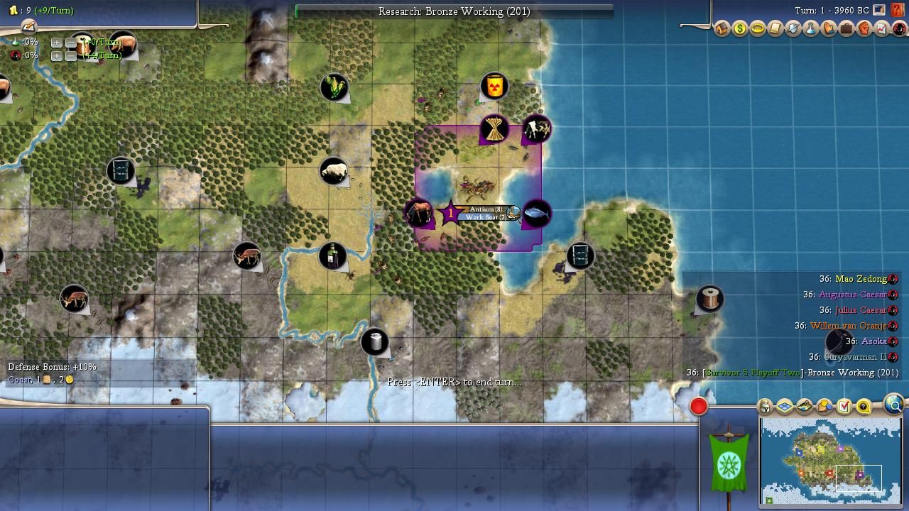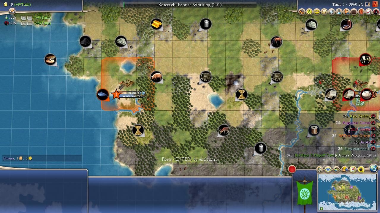 Vunterslaush: The Roman orgy will be a one-sided slaughter with augustus becoming FTD. Mao will get squeezed early by creative sury & willem plus Asoka w/ an early henge. Sury has no ivory and no early happy resources - no thanks. Julius will dominate with willem riding coattails.