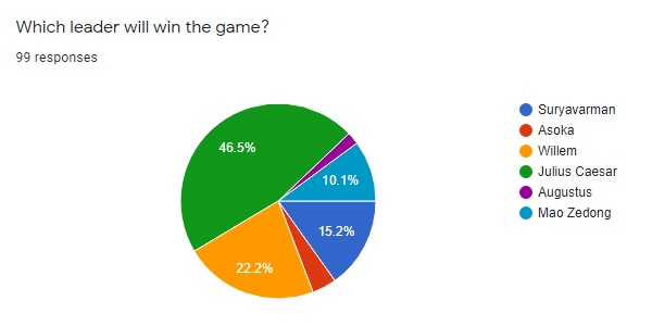 Playoff Two was another game with a clear favorite as Julius Caesar emerged as the victory choice for close to have of the submitted entries. Willem, Suryavarman, and Mao also received a decent amount of support while almost no one was backing Asoka or Augustus. The Runner Up category had a close three-way split between Suryavarman, Mao, and Caesar with all of them polling around 20-30% of the submissions. There seemed to be a general sense that Willem would either win the game or be eliminated and therefore wasn't likely to find himself in the second place spot. The First to Die category unsurprisingly had Asoka as a strong favorite, although perhaps by less than expected with "only" a little over half of the community picking him. And for the victory condition, this was another game where Domination proved to be more popular than Spaceship with about half again as many submissions.
