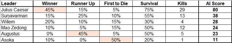 Julius Caesar was by far the best performing leader on this map and it wasn't particularly close. He had three times as many victories as anyone else, also managed three runner up finishes, survived to the end of the game at a higher percentage than anyone else, and had more than double the kills of the next-closest leader. In fact, it was a close contest for a long time as to whether Caesar would finish the alternate history games with more kills than everyone else combined. He didn't quite hit that mark but came shockingly close (29 kills as compared to 35 kills for everyone else together). Julius Caesar's path to victory usually involved an early attack on Asoka which would snowball him into a position where he could begin a methodical conquest of the rest of the map. The ideal situation for Caesar saw him attack Asoka together with Mao while Suryavarman and Willem were tied up in warring with one another and Augustus did his usual inert thing. Caesar attacked Asoka in a strong majority of games and his best performances almost always unfolded in this fashion. He attacked Willem much less often and tended to do worse in those scenarios, partly because Willem defended better than Asoka and partly because leaving the Asoka/Augustus combo alone tended to be bad news for the low peace weight leaders. Caesar almost never attacked Mao and when he did those were his worst-performing games. Naturally that unlikely result is what played out in the actual playoff game and allowed Asoka to emerge as a major power.