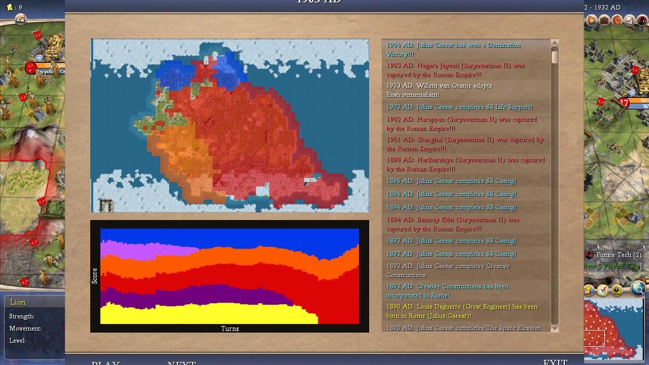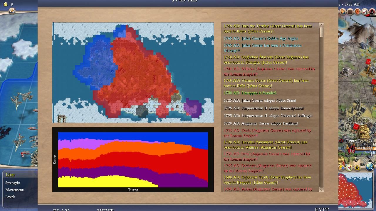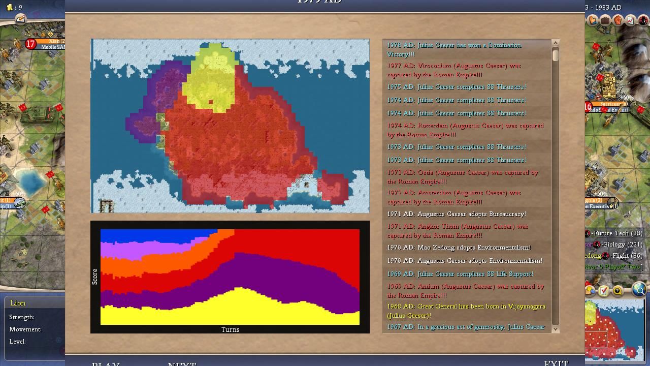 Unfortunately for him, Augustus largely squandered this dream setup and failed to win even one game. He did come close several times but had to settle for being the bridesmaid instead of the bride: a staggering nine runner up finishes in total. In fact, Augustus survived to the end of the game ten times and was the runner up in every one of those games except Game #4 (when he was clinging to life with a single city left at the time the game ended). He was often the score leader coming out of the landgrab phase because he had more territory than anyone else, and Augustus then went on to do very little with the lead that he had been gifted by natural geography. This was a sign of the mediocrity of his AI personality as Augustus is eternally undermined by his conflicting traits. He has Imperialistic for expansion but he also wants to sit back and build wonders with Industrious. He has one of the game's best unique units in praetorians but he's too peaceful to use them most of the time. Augustus wasn't all that peaceful in this game however as he declared war 34 times, most frequently against Julius Caesar and almost always occuring in the midgame. Sometimes these wars hamstrung Caesar by hitting him while he was in the middle of another war and sometimes they served to annoy the game leader while backfiring in spectacular fashion.