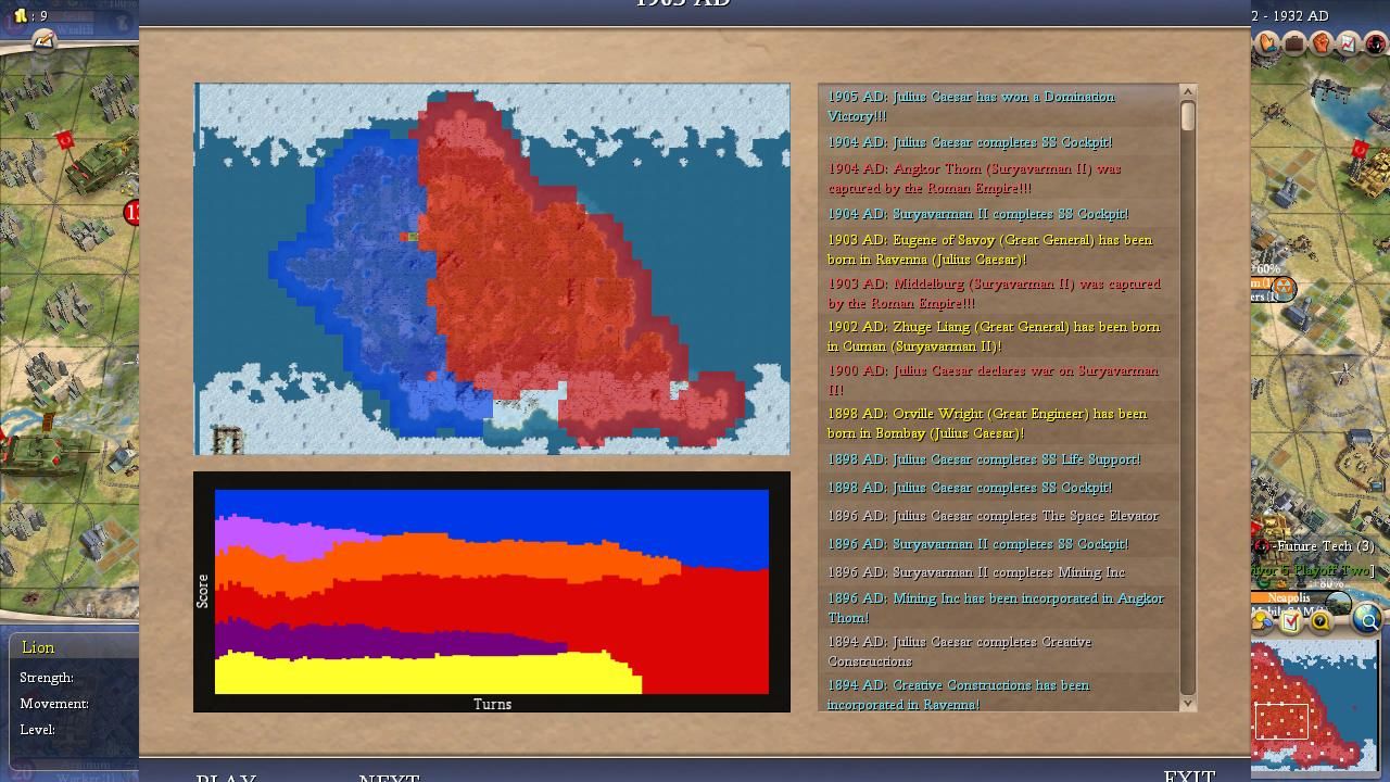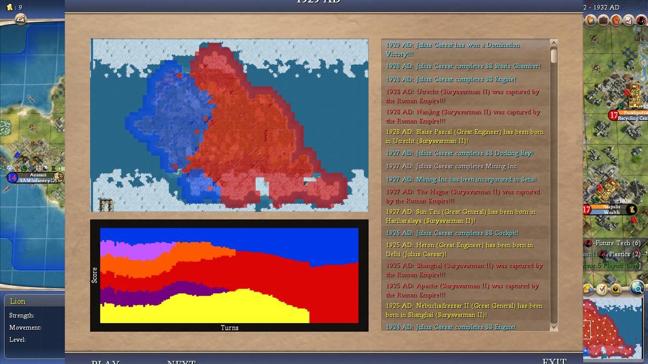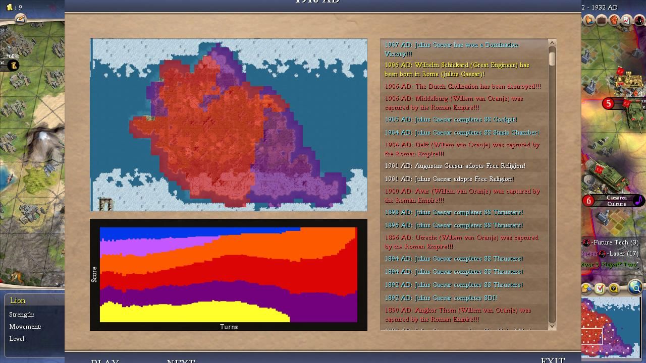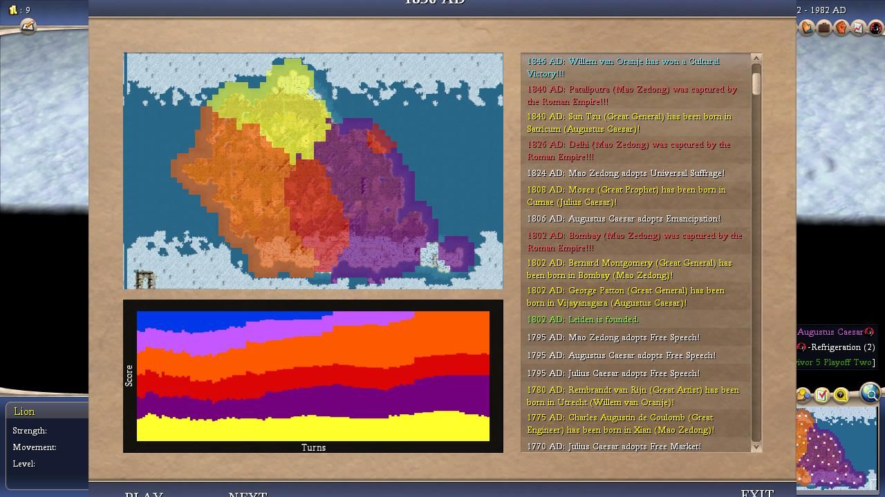 Unfortunately for him, Augustus largely squandered this dream setup and failed to win even one game. He did come close several times but had to settle for being the bridesmaid instead of the bride: a staggering nine runner up finishes in total. In fact, Augustus survived to the end of the game ten times and was the runner up in every one of those games except Game #4 (when he was clinging to life with a single city left at the time the game ended). He was often the score leader coming out of the landgrab phase because he had more territory than anyone else, and Augustus then went on to do very little with the lead that he had been gifted by natural geography. This was a sign of the mediocrity of his AI personality as Augustus is eternally undermined by his conflicting traits. He has Imperialistic for expansion but he also wants to sit back and build wonders with Industrious. He has one of the game's best unique units in praetorians but he's too peaceful to use them most of the time. Augustus wasn't all that peaceful in this game however as he declared war 34 times, most frequently against Julius Caesar and almost always occuring in the midgame. Sometimes these wars hamstrung Caesar by hitting him while he was in the middle of another war and sometimes they served to annoy the game leader while backfiring in spectacular fashion.