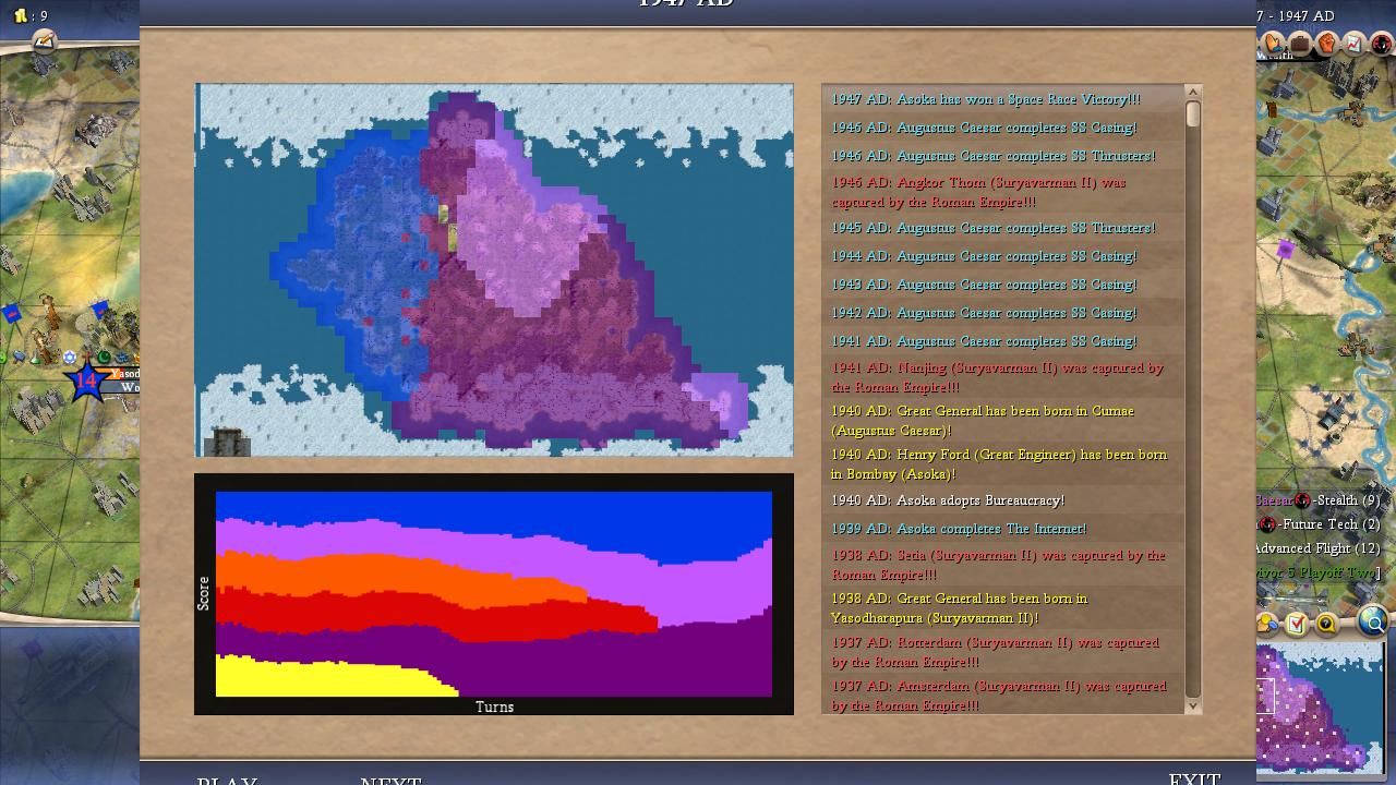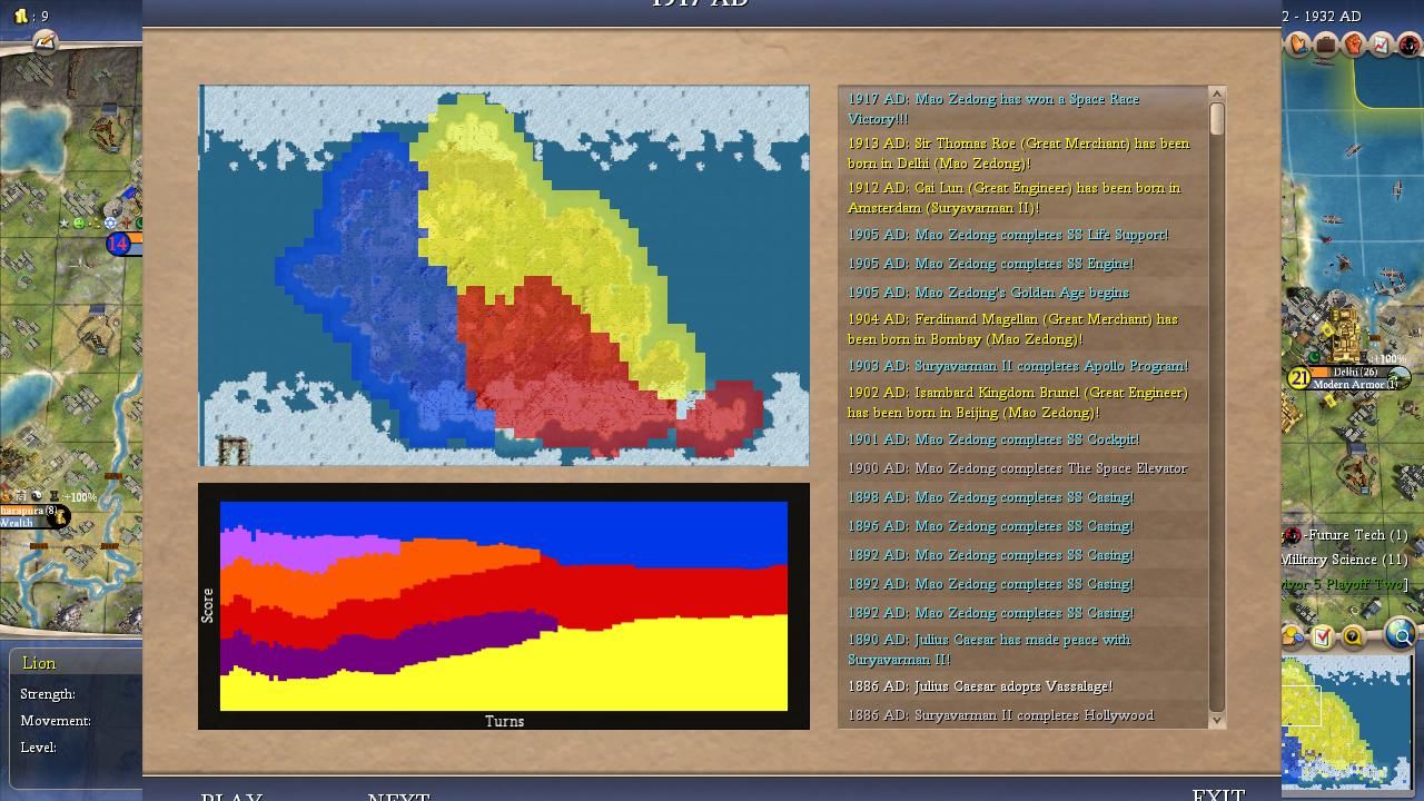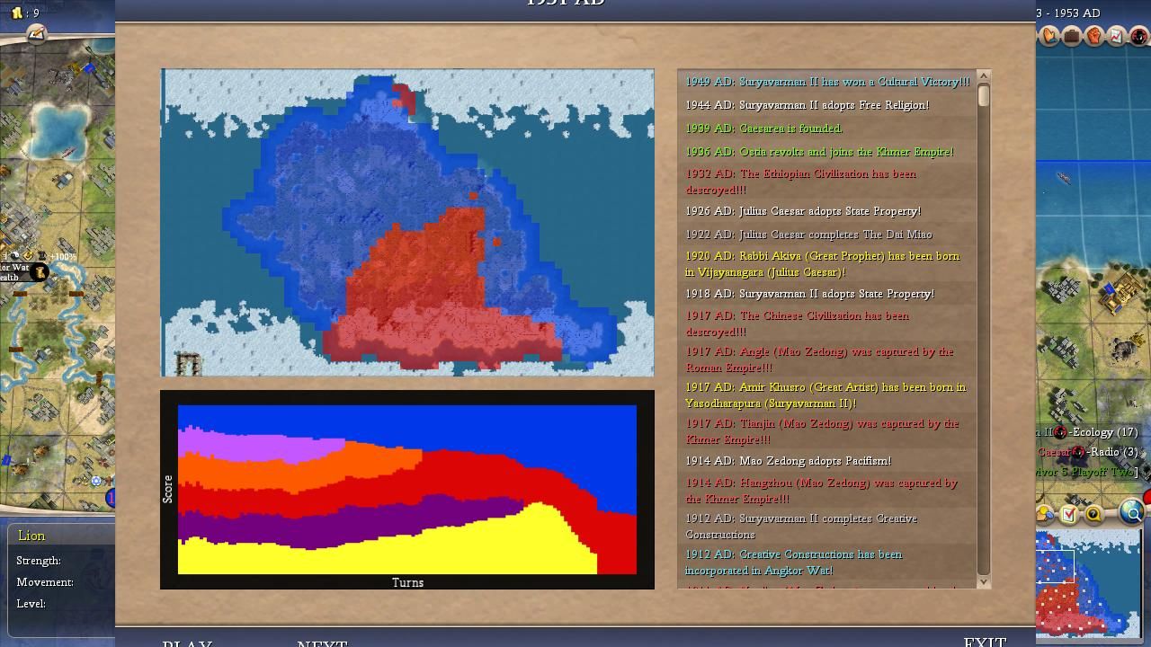 It was also notable how aggressive Suryavarman was on this map. He initiated 45 wars while only being attacked 20 times, an even bigger offensive disparity than what we saw for Julius Caesar. This seemed to be partly due to the sheltered corner starting position of the Khmer as well as the local neighbors in the area. Willem isn't a terribly aggressive leader so most of the Khmer/Dutch conflicts were started by Suryavarman, while Mao tended to attack Asoka in most games and left the Khmer alone. This was likely the main reason why Suryavarman was declared upon less than any other leader in this game. The Khmer leader also tended to chase after Cultural victories again and again, something that everyone should keep in mind for future picking contests. Even his Domination victory took place in the context of Suryavarman running the culture slider and then tipping over the land threshhold via culturally acquired tiles. Suryavarman ended up running the culture slider something like seven or eight different times in the lategame, and this ended up costing him bigtime in Game #11 where he might have won if he'd continued going down the traditional spaceship path. Overall though, the general community sentiment was correct. Suryarvarman was one of the strongest leaders on this map and he absolutely had a decent shot to take one of the top spots.