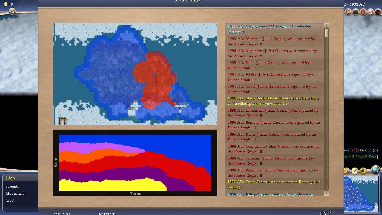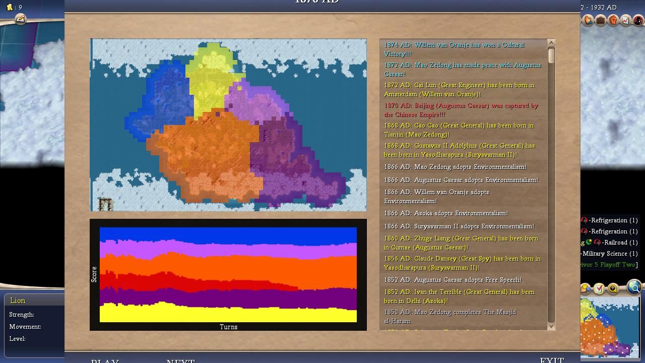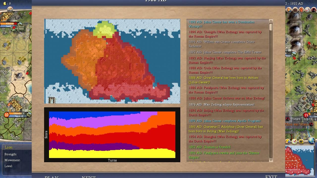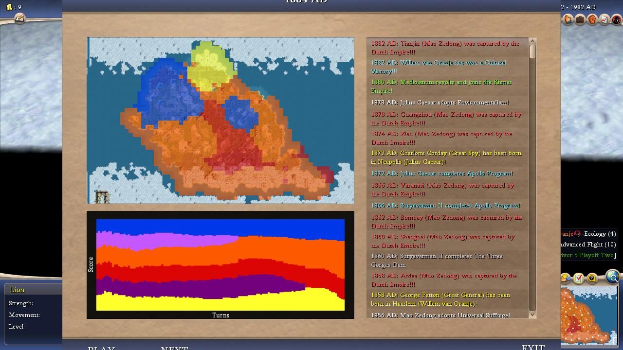 It was also notable how aggressive Suryavarman was on this map. He initiated 45 wars while only being attacked 20 times, an even bigger offensive disparity than what we saw for Julius Caesar. This seemed to be partly due to the sheltered corner starting position of the Khmer as well as the local neighbors in the area. Willem isn't a terribly aggressive leader so most of the Khmer/Dutch conflicts were started by Suryavarman, while Mao tended to attack Asoka in most games and left the Khmer alone. This was likely the main reason why Suryavarman was declared upon less than any other leader in this game. The Khmer leader also tended to chase after Cultural victories again and again, something that everyone should keep in mind for future picking contests. Even his Domination victory took place in the context of Suryavarman running the culture slider and then tipping over the land threshhold via culturally acquired tiles. Suryavarman ended up running the culture slider something like seven or eight different times in the lategame, and this ended up costing him bigtime in Game #11 where he might have won if he'd continued going down the traditional spaceship path. Overall though, the general community sentiment was correct. Suryarvarman was one of the strongest leaders on this map and he absolutely had a decent shot to take one of the top spots.