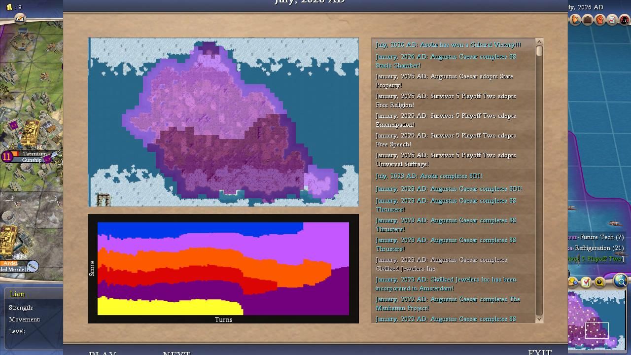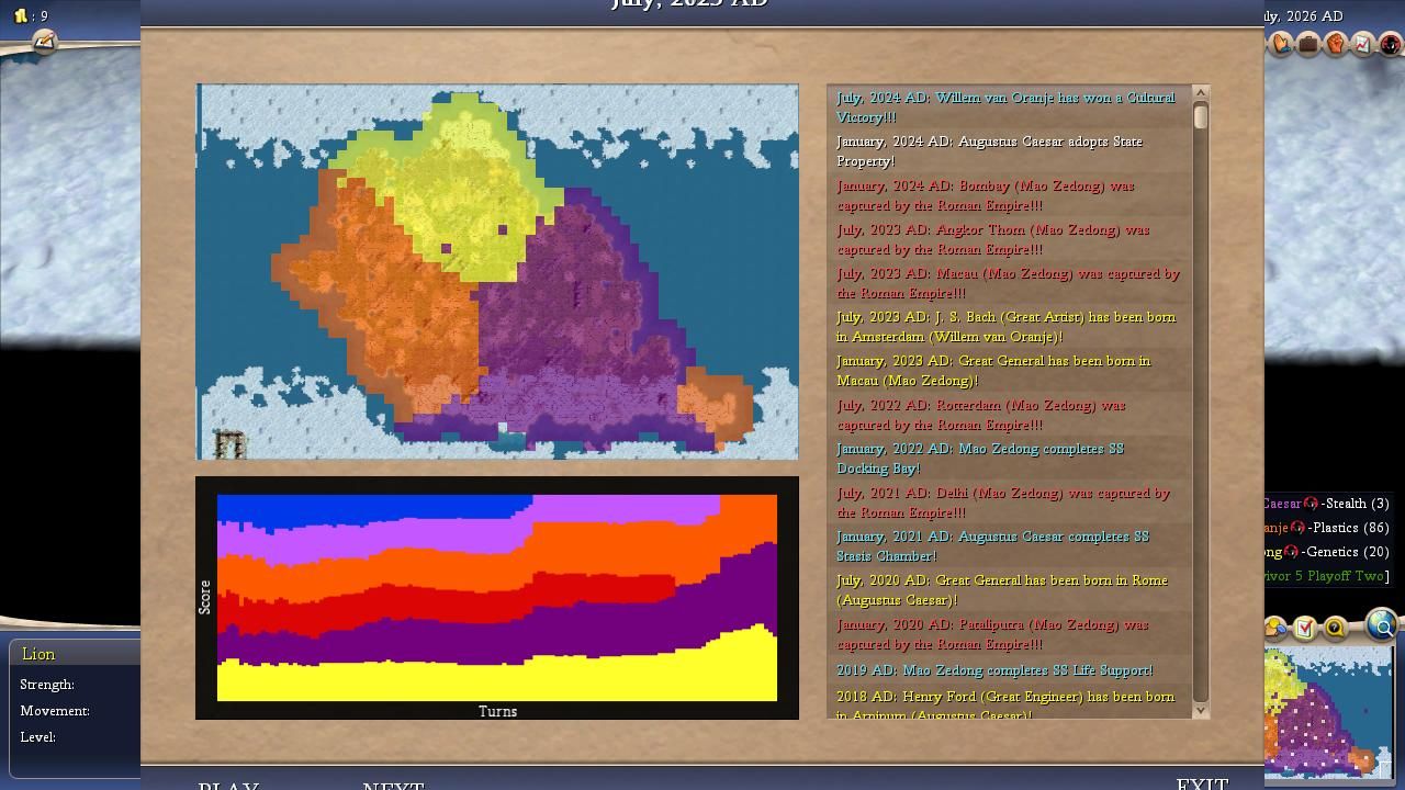 Running the alternate history scenarios proved that the actual result from Playoff Game Two was a low-odds outcome. The low peace weight leaders dominated the scoring by taking home nearly all of the victories, especially Julius Caesar who was a total beast on this map. Asoka was an unlikely, if not completely impossible, leader to emerge with the victory. It could and did happen but certainly not very often. One of the surprising results was the observation that Augustus was the clear best choice for the Runner Up pick, suggesting that an isolated spot far away from the top contenders may be one of the best qualities for that picking contest category. I'm personally disappointed that we won't get to see a more dynamic leader like Julius Caesar or Suryavarman in the championship game but that's the way that things shake out sometimes. Upset wins are a part of any competition. At least we can all rest assured that we're not crazy - Asoka getting completely ignored during his farmer's gambit was *NOT* a common outcome at all!
