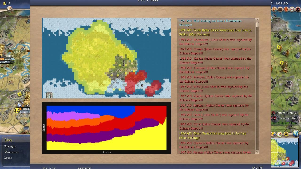 The picking contest had Asoka identified as the runaway leader as First to Die and the alternate history scenarios proved that the community was correct! Asoka was the punching bag of this world as he was eliminated in 80% of the alternate history scenarios. He was also First to Die in fully half of these games, ten different times in all, suffering eliminations on Turn 177, Turn 179, Turn 135, Turn 124, Turn 103, Turn 109, Turn 164, Turn 175, Turn 154, and finally a blazing Turn 99 in the last match. After not facing a single war declaration at all in the official playoff game, Asoka was attacked 54 different times in the alternate history scenarios, far and away more than any of the other AI leaders. It was even more impressive how many times India was invaded considering how few turns there was an Indian leader alive on the map to be invaded at all. Asoka was attacked almost three times per game on average and he was invaded at least once in every single one of the twenty alternate history games. The fact that he was never attacked in the actual Playoff Two game was therefore an extremely unlikely outlier result, something that appears to have had odds of less than 5%. We thought that this was bizarre at the time and we were completely right.