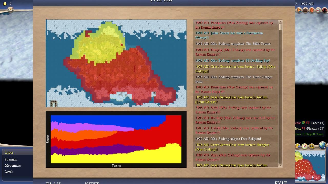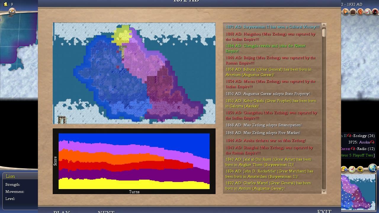 We saw a dogpile of Mao in the actual playoff game and I found that this was occasionally repeated in the alternate history scenarios. It wasn't exactly common but it did pop up several more times, with Mao being ganged up upon more often than any of the other leaders. I suspect that peace weight was responsible for this; while Suryavarman had an equally low peace weight score of 1, he was more isolated than Mao and therefore less likely to pull aggression from the eastern high peace weight leaders. The bulk of the war declarations from Augustus were targeted at Julius Caesar but if he wasn't attacking the other Romans he was invading the Chinese. And while Asoka almost never fought anyone, his rare wars almost entirely came against Mao. It was always a bad sign for the Chinese when Asoka was still alive in the midgame, as a strong India and eastern Rome meant trouble for Mao. He also had a tendency to fall apart in the midgame, often coming out of the initial fighting in a solid position and then collapsing afterwards. Mao was frequently sitting in third or fourth place in these games, not the first one to be eliminated but also not a serious threat to win the game. He was looking like one of the worst leaders for a while until rallying for two victories and eight kills in the last eight matches that I ran. Overall Mao was definitely the weakest of the low peace weight leaders on this map. He's a strong enough AI Survivor leader that he was still a factor in this game but it wasn't a great setup for him and he wasn't one of the better choices in the picking contest.