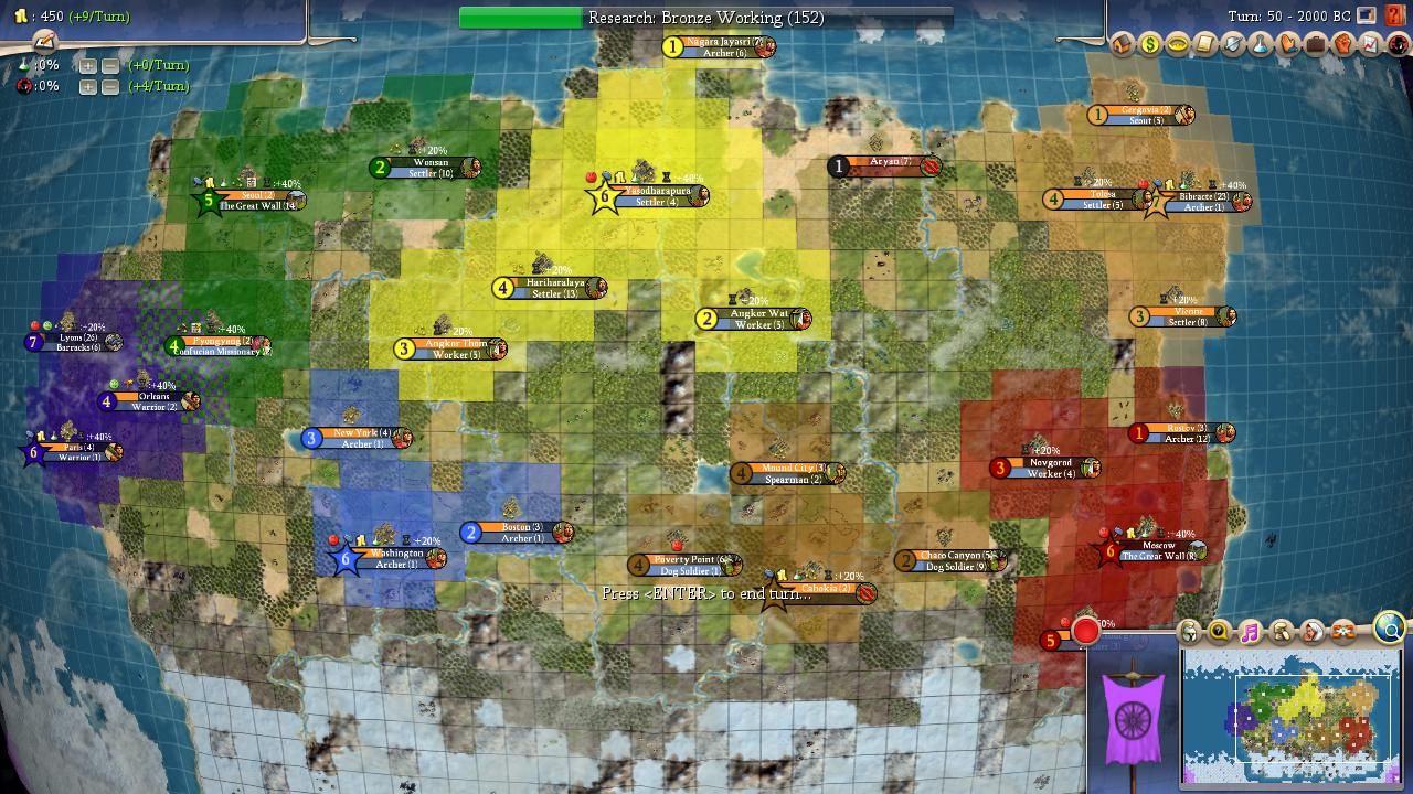 The double holy cities in the west left most of the world religion-less throughout the early game. Suryavarman had the best expansion out of the gate, claiming a lot of strong land to his south and taking advantage of the slow start of Brennus off to his east. The other western leaders were slower to grab territory, investing too much time into wonder-building rather than pushing settlers. Louis in particular was obsessed with wonders by building Stonehenge and Temple of Artemis. Despite his amazing capital, he would only end up with five cities thanks to his over-emphasis on wonders. Wang Kon wasn't much better and would end up boxed into the northwest corner of the map due to Suryavarman's expansion. Roosevelt wound up winning the Pyramids race at the cost of similarly stalling out on expansion thanks to chasing after the big wonder prizes.