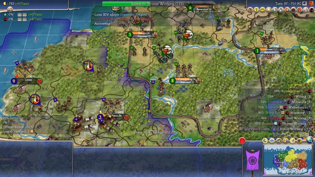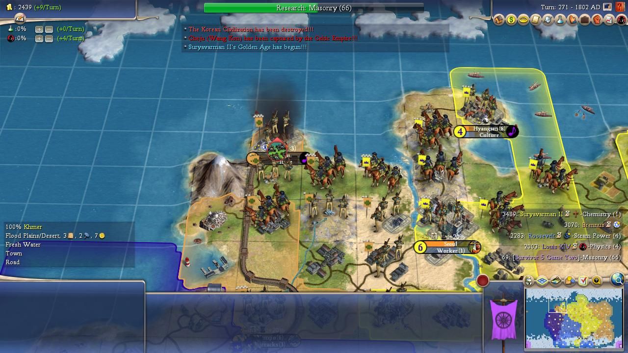 One of the weird things about this particular competition was the fact that no one ever seemed to pull ahead or fall behind in tech. The AI leaders remained bunched together on the tech tree for almost the entire game, with the smaller civs in the west having better economies to balance out the larger civs in the east. While Catherine and Sitting Bull had been crashing out of the game, Louis had been fighting several wars against Roosevelt without any territory changing hands. The gamelong stalemate in the west continued for the moment but it was inevitable that it couldn't last forever. Suryavarman and Brennus had become too powerful and the Khmer leader was "Furious" with Wang Kon for their earlier warring. Brennus declared war against the Koreans first on Turn 227 and then Suryavarman joined the party half a dozen turns later. Even Louis piled onto the fray once it became clear which way the wind was blowing. Wang Kon made it to Rifling tech during the war and it didn't end up mattering at all, not when outnumbered to such an enormous degree. Three dozen turns later he was eliminated as well: