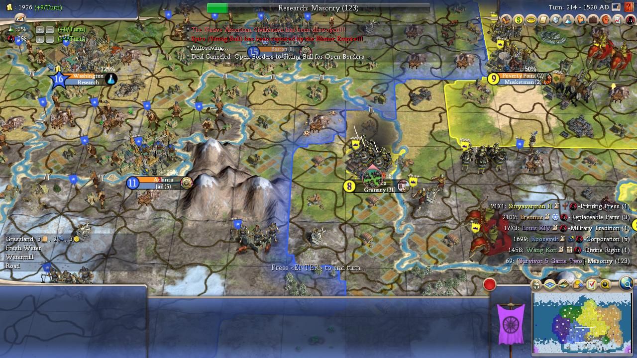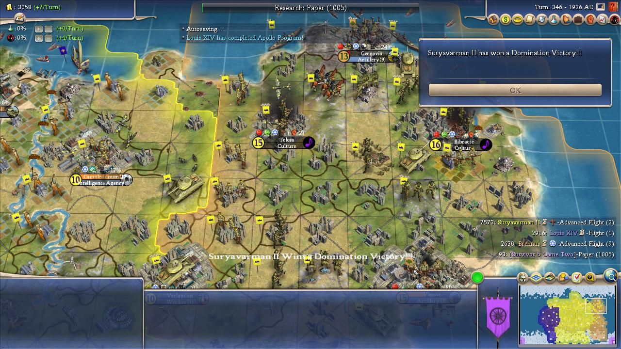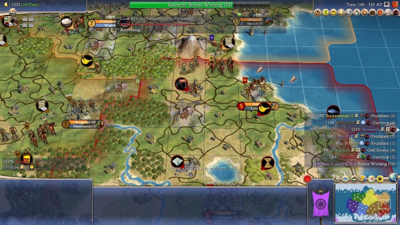In the end, Brennus just couldn't hold on long enough. He dropped below Louis on Turn 342 and the game ended four turns later:
