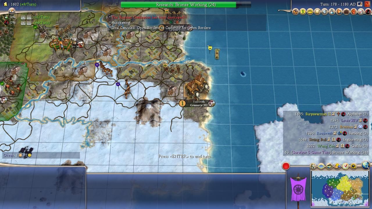 The Civ4 AIs are good at sniffing out weakness and a minor dogpile ensued against Catherine. Already at war with Brennus and Sitting Bull, the Russians were also hit with an invasion from Wang Kon who walked completely across the globe to attack and pick up a random city in the southern tundra. That was all that the Koreans would end up taking, with the Celts getting the lion's share of the spoils along with the elimination credit: