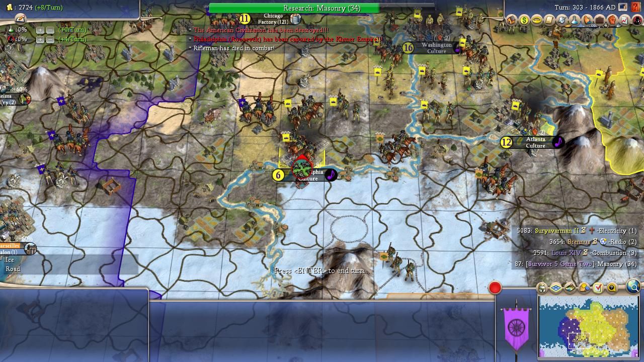 For the third time this game, Suryavarman found himself picking up nearly all of the spoils in a shared war with Brennus. The Celts grabbed one American core city, another single tundra iceball city, and the French also picked up a former barb colony in the extreme south. Everything else, including all of the other core cities, went to the Khmer. It still wasn't exactly clear why Suryavarman had been so much better than Brennus at capturing cities when they both had a shot at the prize. Nevertheless, all of those 50/50 shots going the way of the Khmer had added up enormously over time, with Suryavarman surging far out in front of his competitor on the scoreboard. It looked as though he would have his pick of any victory condition that he wanted, with the possibility to go for both Spaceship and Domination depending on how Suryavarman felt. No one was especially close to finishing the tech tree and Louis had an outside chance of winning via Culture if the game dragged out. Even the Diplomatic victory was technically a possibility if Suryavarman could improve his relationship with Louis enough to secure his vote.