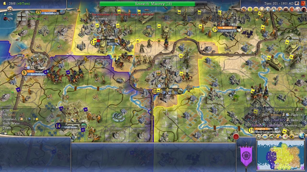 Once again, most of the rewards from this conflict accrued to Suryavarman. This time the actual city conquests had been split roughly in half between the Celts and the Khmer, but the cities that Brennus picked up were largely engulfed by French or Khmer culture. They contributed little to the rest of the empire. By contrast, the Khmer conquests were easily integrated into the rest of Suryavarman's territory and could become full participants in the industrial economy under development. This was another unlucky break for Brennus due to the geography of the rest of the world.