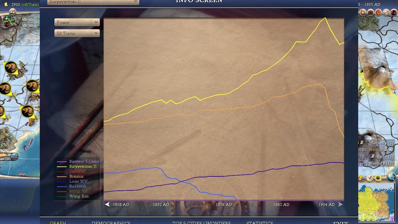 It was an unfortunate ending for the Celtic leader given the strong game that he had played, strong after the early turns anyway. If he had been able to conquer cities just a little bit more effectively, he likely would have been able to make it into the playoffs as the second place leader. He was certainly more deserving of a playoff spot than Louis, who had built too many wonders and fought a series of ineffective wars against Wang Kon and Roosevelt. This was the classic case of a weaker leader riding the coattails of a stronger leader into the next round of the tournament. The only leader who looked to have played a genuinely strong game was Suryavarman, starting with good expansion and then snowballing a conquest of Sitting Bull into the game's dominant spot. Only the two times that Suryavarman was blindsided with a two front war (first by Roosevelt and then later by Wang Kon) had stopped him from running away with this game much earlier. He had been deserving of the Pool 1 seeded spot in this game.