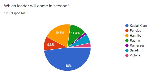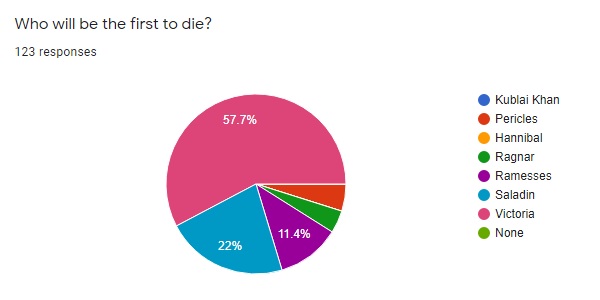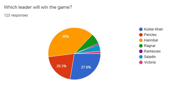 This was the first game of Season Four that didn't have a clear favorite for the winner. While there was a preference for Hannibal amongst the community, he was only drawing a little bit above a third of the vote and faced significant competition in popularity from Kublai Khan and Pericles. By contrast, this was the rare game with a consensus for the second place category, usually the hardest to pick, with Kublai Khan taking almost half of the total votes. At the other end of the spectrum, Victoria was overwhelmingly the most popular choice to be First to Die, with most of the community expecting a continuation of her streak of failure from past seasons. And when it came to the victory conditions, Domination and Spaceship were once again close in popularity along with a small Pericles-favoring minority who had Cultural as the ending result.