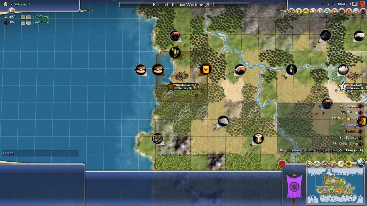 Willem: I'm figuring: a bloodbath! Kublai gets cramped, still gets big somehow, but then goes irrelevant somehow anyway. Viccy inexplicably dies while baba yetu is still fading out. Hannibal wins. So Viccy, with otherwise excellent prospects in a midgame, won't make it to the midgame yet again; like Mouse in the Matrix, Viccy falls heroically but unprepared in a hail of gunfire. In the midgame, Saladin's list of high peaceweight allies runs thin and he may have a glorious hero's end, may be a kid fortifying a sandcastle as high tide comes in... probably...- actually, Saladin could even be a dark horse longshot to win it if he joins in the right feeding frenzies and holds the line, like a snapping turtle... but i doubt it. The Hannibal domination - though much more measured and reasonable than Kublai's hopes - may be spoiled early by saladin/saladin's religion or by eastern alliances but is an interesting wrinkle of a possibility nonetheless. Pericles has great room in this map roll, as as does Ragnar. I like Pericles' chances. Pericles may have a culture win spoiled by his buddy ram who he may have to split some wonders with. Hannibal could also clash with him enough to spoil his hopes. Kublai could end up with 50%+ landmass and blunder his way to victory when he has so much land that he can't lose even with him seemly trying throw his lategame away at every opportunity.