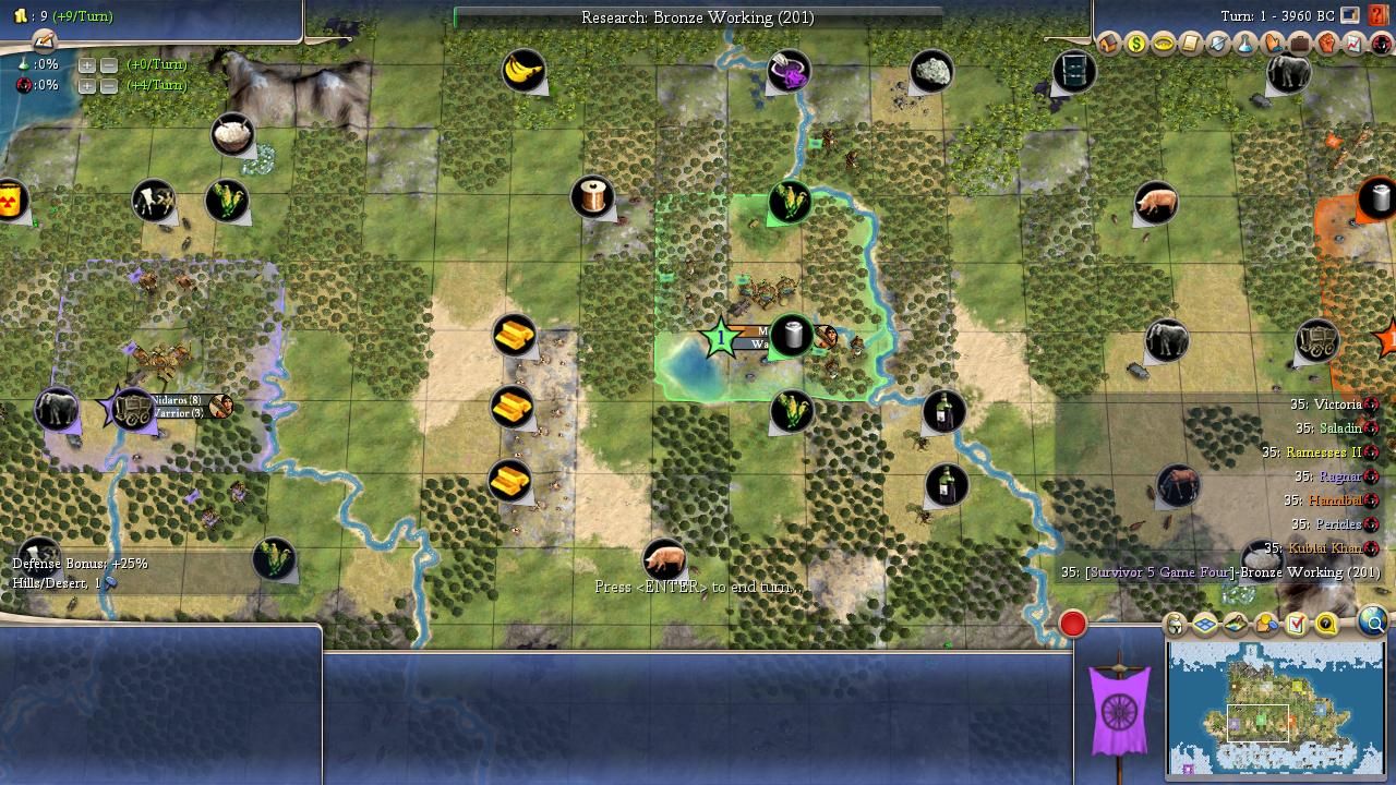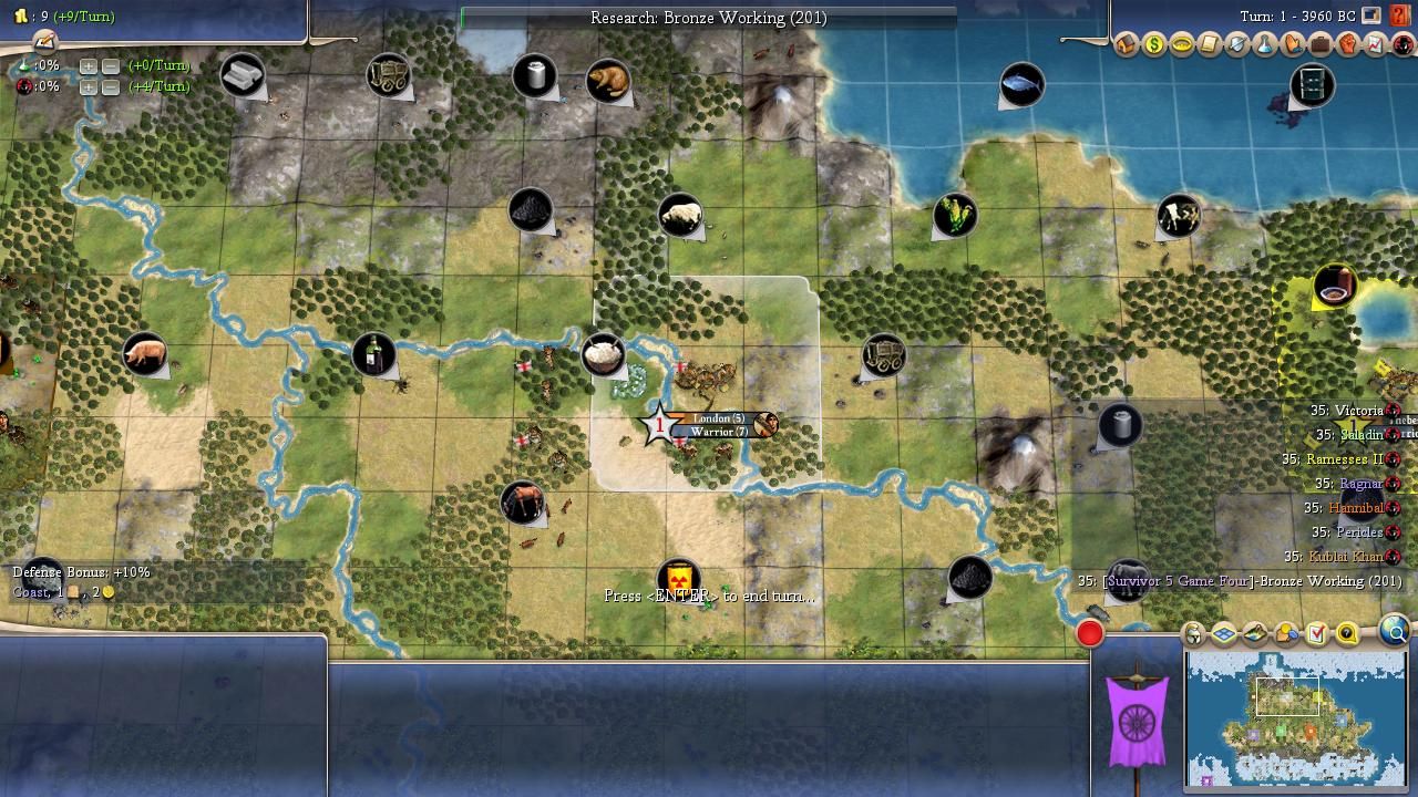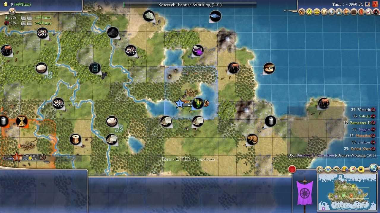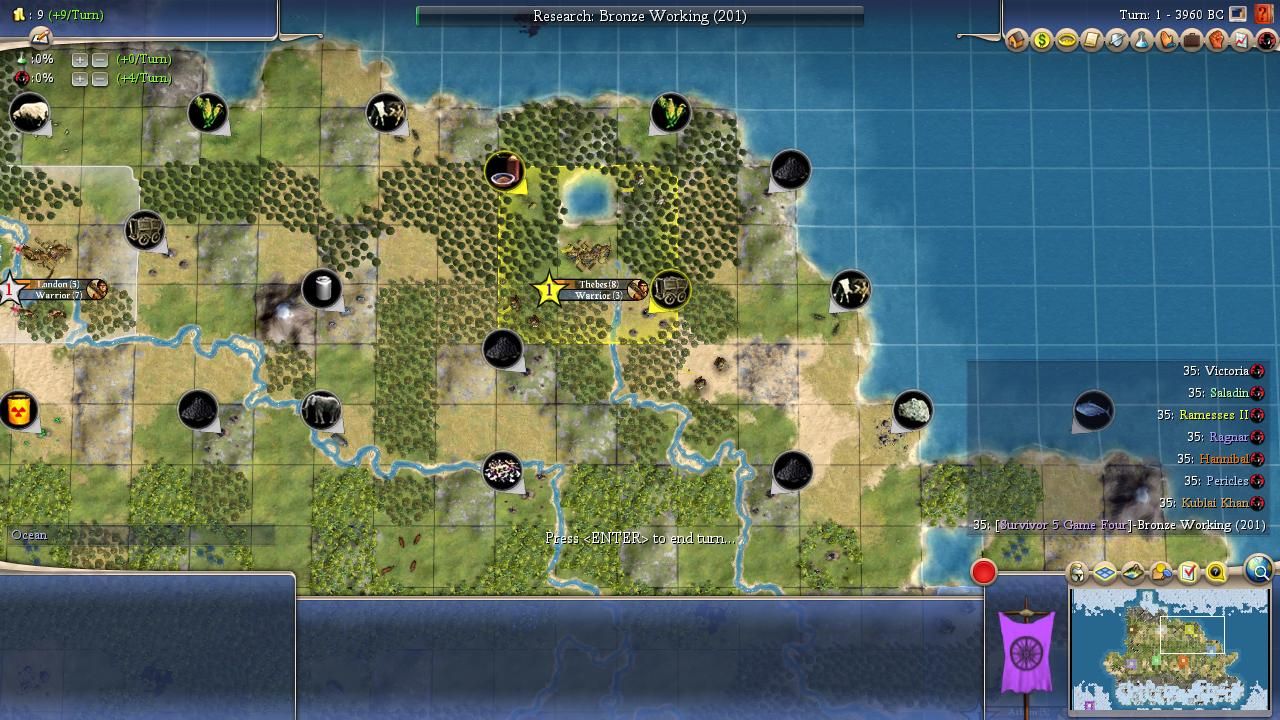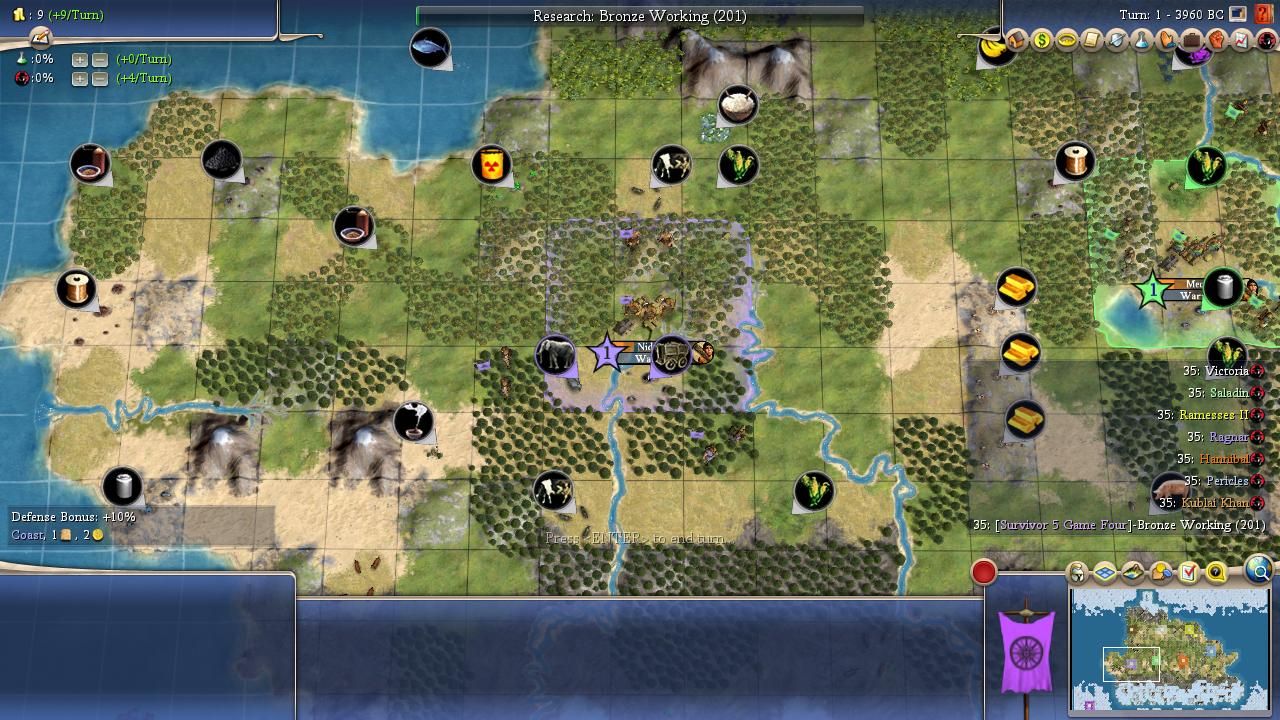 MirrorG: Okay! So! Game 2 was bad, Game 3 was worse, so how about this: Pericles has a whole corner of the map to himself, with Victoria and Ramses providing a buffer between him and the most aggressive competition of Kublai and Ragnar. The big question mark in this game is Hannibal, who can either choose to focus west and slow down the warmongers, expand north and have the high peace weight buffer take the heat for Pericles, or focus east and ruin the Greeks' picnic. For the sake of my poor, poor score total, I'm banking on it not being the last one. As Kublai isn't quite as a performer as Caesar, I think he has a much bigger chance of stalling out / getting distracted before he can poke at the cultural civ's corner of the map (especially with Ragnar there to drag up the war count and Saladin to create diplomatic blocs with the religion he's undoubtedly going to grab), giving Greece enough time to watch the world burn as they stroll towards a cultural win. ...Just got to hope I'm actually right, this time :V