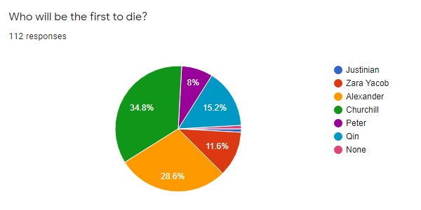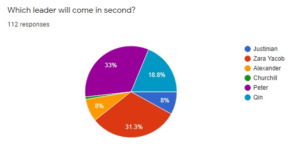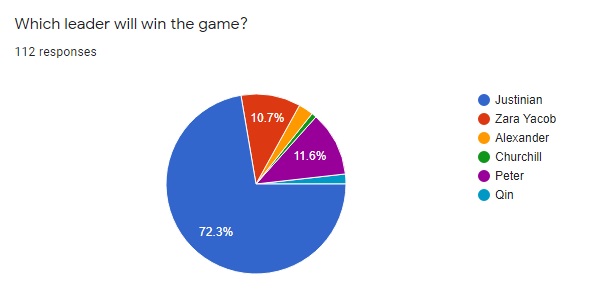 The community agreed on exactly one thing for Game Seven: that Justinian would likely take home the top prize. Aside from that, there was no consensus at all in any of the other scoring categories. Peter, Zara, and Qin all had significant backing in the Runner Up category without any clear favorite leading the pack. Unlike most of the other games this season, there was also no one standing out from the pack in the First to Die contest. Opinion was divided between Churchill, Alexander, Qin, and Zara. Once again, we saw a nearly-exact division between Domination and Spaceship when it came to the victory condition despite a recent run on Cultural victory outcomes. Whoever could figure out the non-winner categories would be the scoring contest entry that took home the prize.
