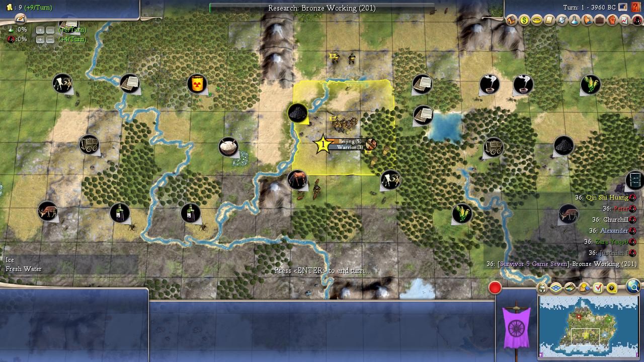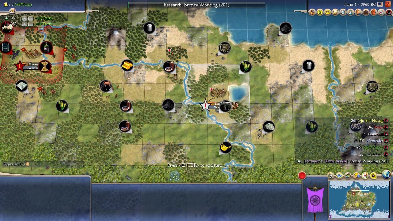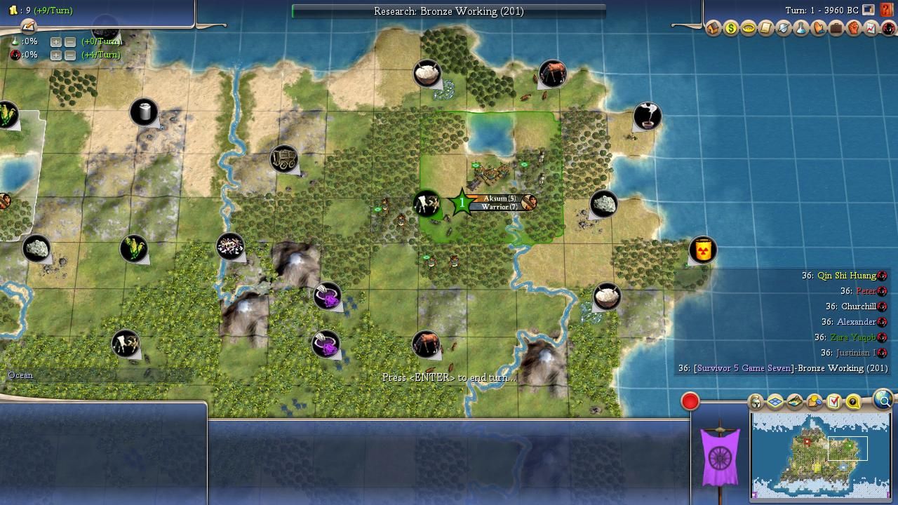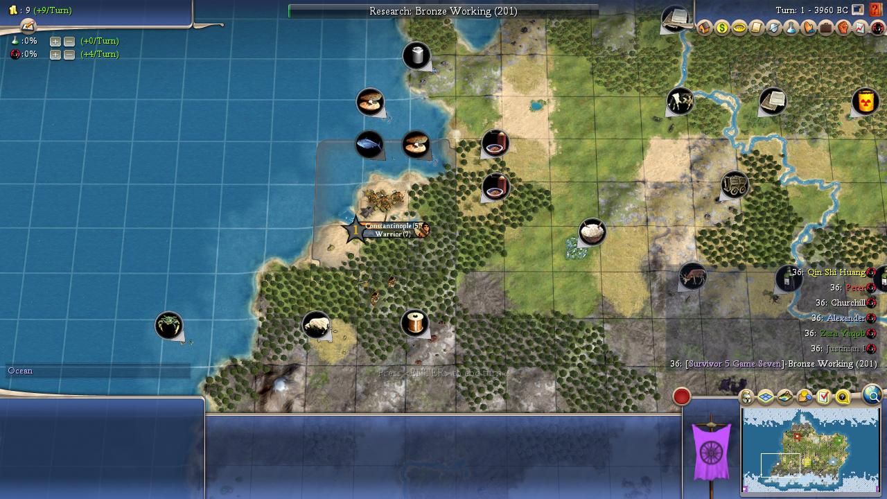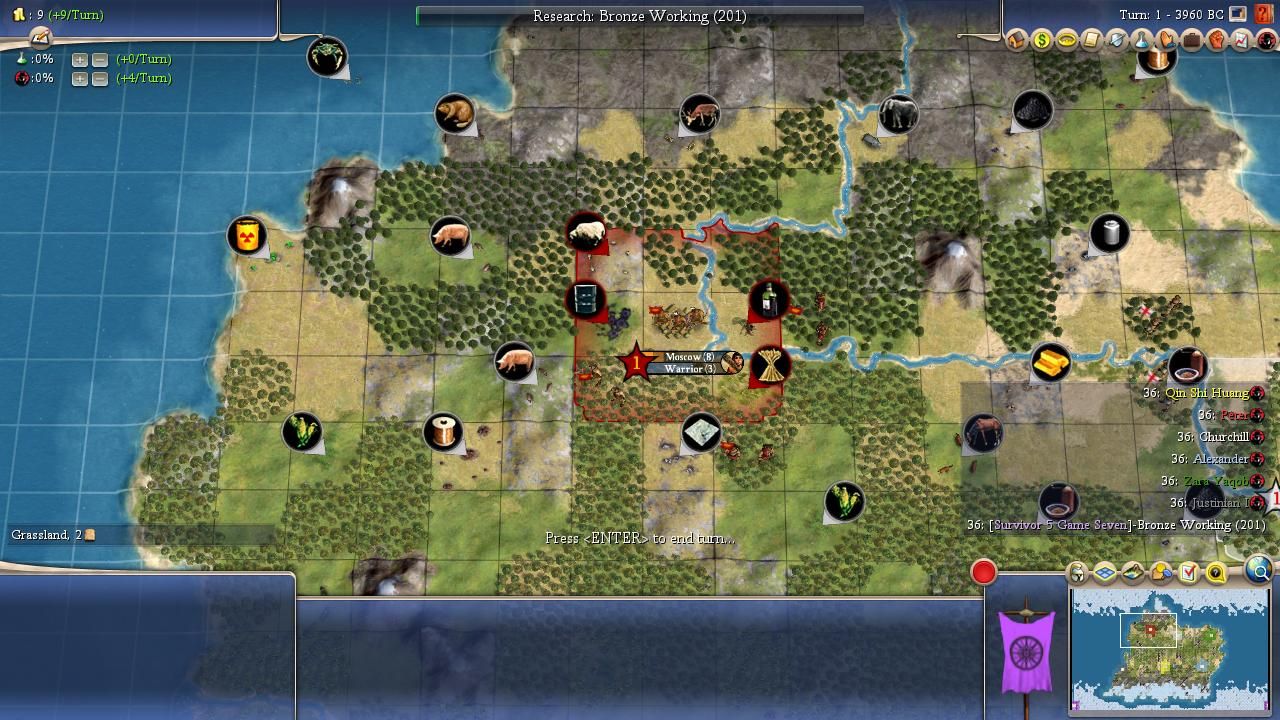 Bobchillingworth: I'd like to select Justinian to place, as he has a significant corner of the map to himself and I doubt he'll be eliminated, but his capital is a terrible mismatch for his starting techs and research preferences; he needs Fishing and BW to make anything of it, and it'll take him a good while to get there. He'll be backwards for a long while, and there's a good chance he'll be too Pleased with his neighbors to conquer anyone. Alex would be my favorite, since he's got a perfect setup to kill Zara early and run away with the game, but while I anticipate he'll manage (or heavily assist with) the former he'll tech slowly and inevitably involve himself in disastrous wars of choice which drag him down. Might well make it into the Wildcard game though. Qin has an excellent capital for his ideal starting techs, and can expand in almost any direction and do well. Protective keeps him reasonably safe from a low-odds Alex declaration until he can tech Iron Working; I think he'll be popular, the tech leader, and eventually stumble into a rare Diplo win after Zara and Churchill bite it.