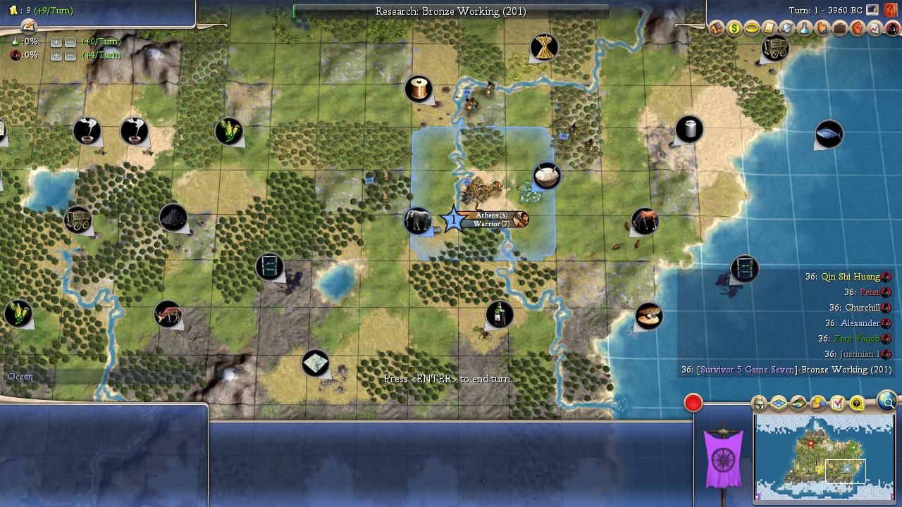 The field in Game Seven appeared to be an uninspiring lot aside from the seeded leaders. The standout in this group was Pool 1 leader Justinian, winner of Season One of AI Survivor and nearly a repeat winner at the conclusion of Season Three. Justinian combines together strong expansion with his Imperialistic trait and a tendency to form enduring alliances via shared religious faith. He would likely be opposed in the religious race by the Pool 2 seeded leader Zara Yacob, another AI leader with an unusually high emphasis on faith. Zara had a fantastic showing in Season One of AI Survivor yet struggled to make much headway in the years since then. The unseeded leaders were a mixed assortment with a little bit of everything, from Alexander's militarism to Churchill's defensive turtling to Qin's wonder building. Outside of Justinian and Zara this was a pretty lifeless group of leaders. We'd have to see if any of them could make a name for themselves in this match.