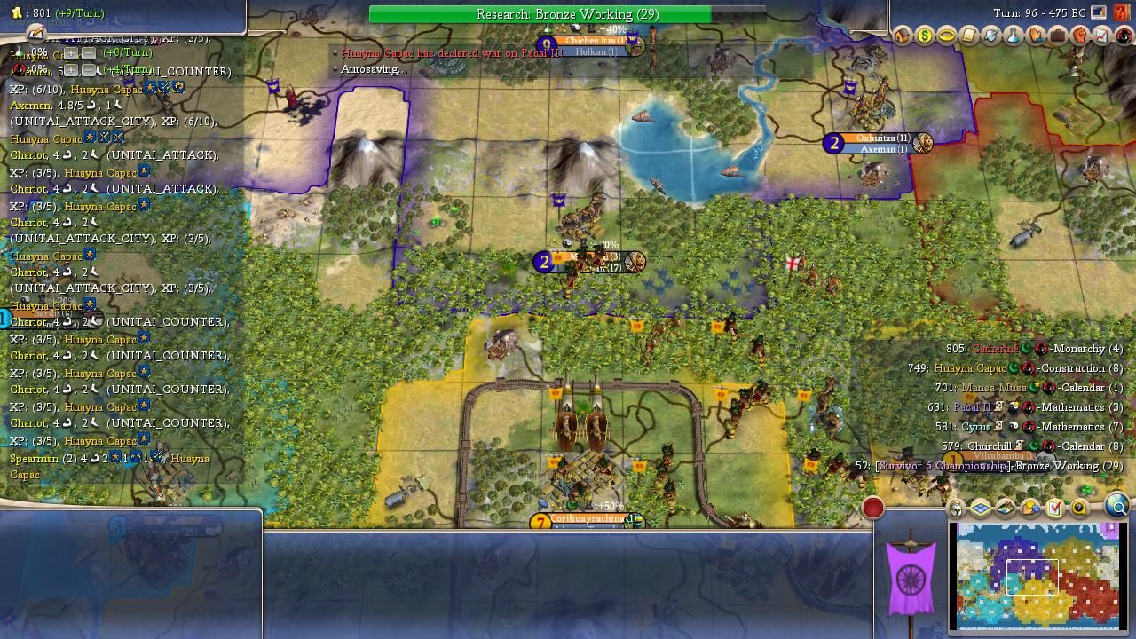 But Pacal would not live to see the game's end himself. Nobody ever intervened in his war, and there was no stopping the English attack, not when Churchill had such a huge lead in city count. Pacal was able to hold out for long enough that he was still alive just 8 turns from the game's end, but no longer than that. It was a poor game from him after he'd suffered from an early attack by Huayna Capac, one that dealt a big enough blow to permanently put him on a level below the other leaders in the game. With the smaller territorial base that the early war left him with, he wasn't able to keep up with the tech leaders or find good prospects for conquest, and between that and his relatively passive AI personality, he ended up not doing much of anything in this game except for slowing Mansa's cultural push by denying him important wonders. Pacal has been successful enough across the competition's history to make it clear that he's one of the better overall leaders - his excellent traits and economic bent make him a better techer than most, and he's going to be a threat to win on many maps. But he's also not quite at the top tier, and the title continues to elude his grasp.