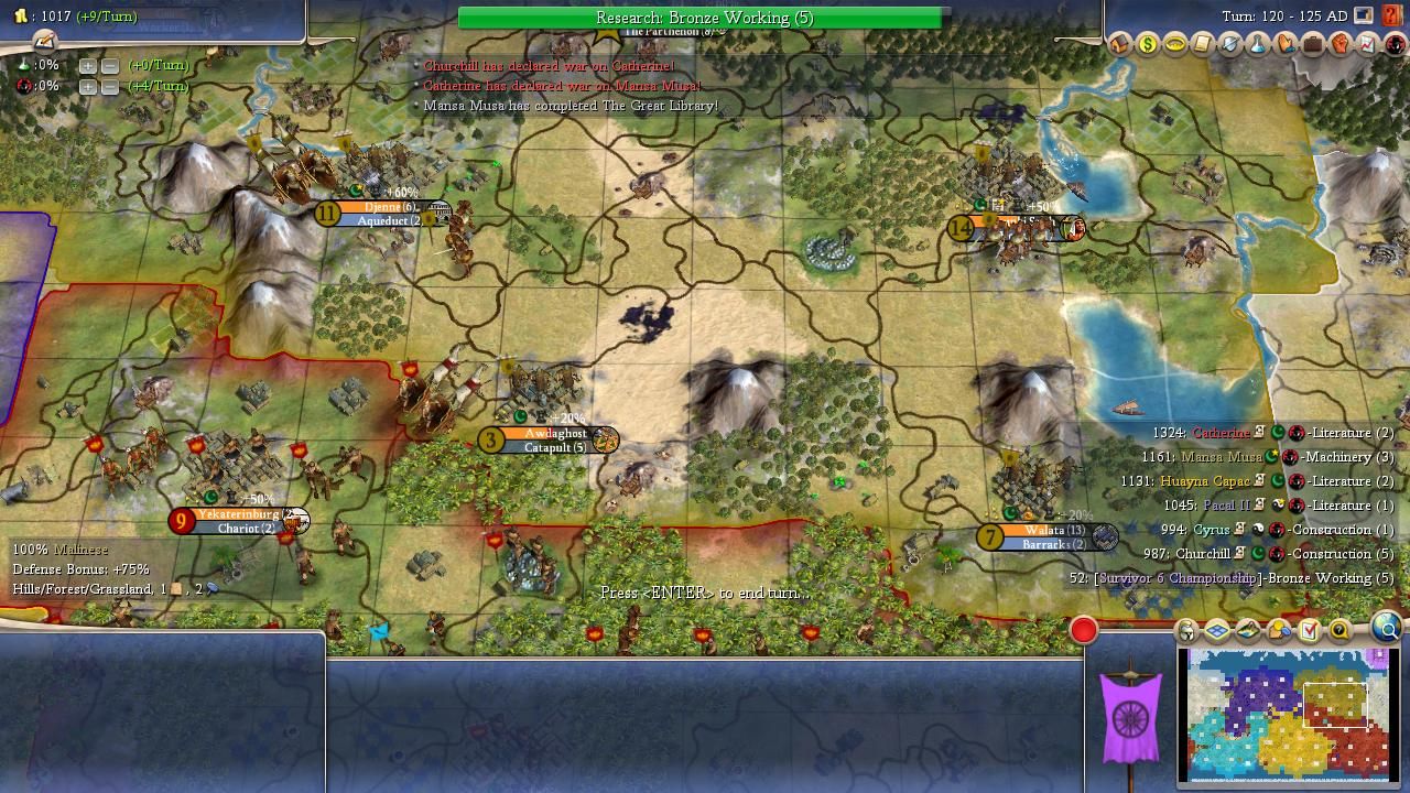 Cathy's two-front war continued to be the main story for quite a while, with not a lot else of interest happening. Huayna captured a second city from Pacal before signing peace, having knocked Pacal out of contention but not become a runaway himself. A few turns later, Cyrus declared war on Huayna, but this war proved inconclusive, with no cities permanently changing hands before they signed peace. Thus the focus remained on Catherine. She had drawn first blood in the war, taking one of Mansa's cities, but he was able to then clean up her attack stack and take one of her cities in retaliation. With Churchill just suiciding his siege-free stacks against a border city on a hill, this war stayed in stalemate for a while - but then Churchill added catapults to his army, mounted a new assault, and captured the city. The two-front war was starting to take its toll on Cathy, and without any help in the fight, she couldn't keep pace with her opponents. Slowly but surely, Mansa and Churchill started to grind her down. Churchill retook the captured Malian city and gifted it back to Mansa, then in a critical pair of sieges, the two leaders took Cathy's two northernmost remaining cities. That pair of captures dropped her all the way down to last place on the scoreboard, a stark contrast to the comfortable first place she'd been in at the start of the war. Huayna, Pacal, and Cyrus were content to just sit back and do nothing as Russia burned, and so Mansa and Churchill continued their conquest. Cathy was able to get castles in her cities, but their only effect was to make the sieges take longer to pull off. They didn't change the outcomes at all.