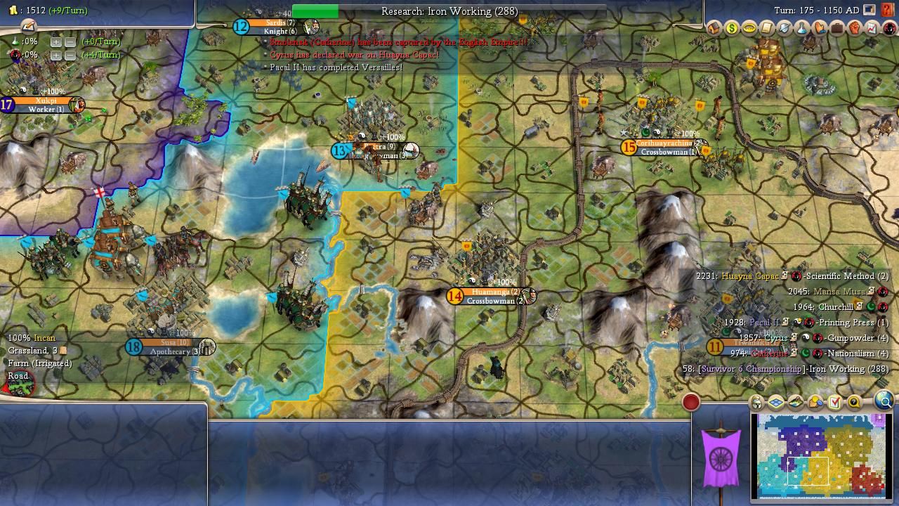 Good news came for Mansa in the following turns, as the leaders who had been on the defensive in their wars were managing to stave off elimination. Pacal realized how much of a mistake he had made, and handed one of his cities over to Churchill in exchange for peace. He had lost a total of two more cities in this war, but was still alive for now. Meanwhile, Cyrus had managed to completely throw away his advantage in the war with Huayna Capac. After taking the first couple of Incan cities, he sent his stack at the next one... only to fail to bring siege weapons and just attack into 60% defenses in a city on a hill. His attack stack was obliterated, and soon afterwards Huayna FINALLY researched Rifling to alleviate the situation. Cyrus sent another attack stack, with siege units this time, but the rifle defenders made the difference and that stack was wiped out to a man. As the war continued to grind on, it seemed like Cyrus still had the advantage - Huayna had rifles, but he wasn't building enough of them to completely halt Cyrus's assault. But he was able to successfully slow it down, and Cyrus finally decided it wasn't worth the trouble anymore, signing peace after taking a couple more cities. Huayna had held, and he was still the tech leader in this game thanks to Mansa having turned off research. But just as importantly, both this and Churchill's war with Pacal had been inconclusive, with none of the leaders involved snowballing ahead. They mostly served to buy more time for Mansa.