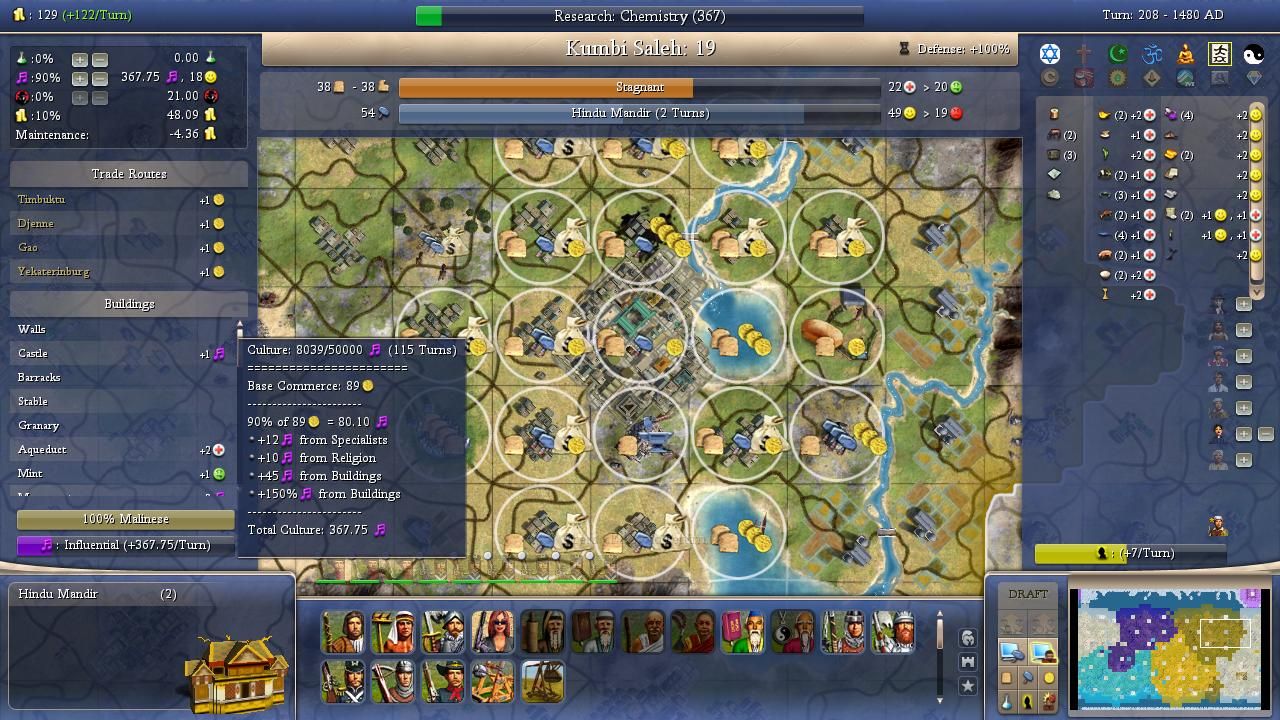 But despite the early disparities in settling, things normalized as the landgrab phase went on. At a certain point Cyrus and Cathy simply stopped founding cities, and everybody else started founding more. As a result, everybody had between 7 and 9 cities at the end of the landgrab phase, with no huge disparities in that regard. The leaders at this point seemed to be Pacal, the only leader with 9 cities despite his slow start; Huayna, who'd been able to settle a decent number of cities, capture one of those barb cities, and secure a position near the top of the scoreboard; and Cathy, whose early plants combined with the Creative trait had allowed her the most time to develop all of her cities and put her atop the scoreboard. On the other hand, Mansa had been leading the early economic race (thanks to many turns of deficit research from a pair of early Great Merchants), but having a bit less land and fewer cities than most of the field was clouding his prospects. Churchill had largely stalled out, not doing much of anything after his quick push to five cities. He had founded a few more later on, but done nothing of note yet. He and Cyrus had also both refused to tech Mysticism and put culture in their cities, limiting their early growth; Cyrus had exploded out to a quick city count, only to stop, fail to expand his borders, and see Pacal claim some sites that really should have been his, neutralizing his early lead.