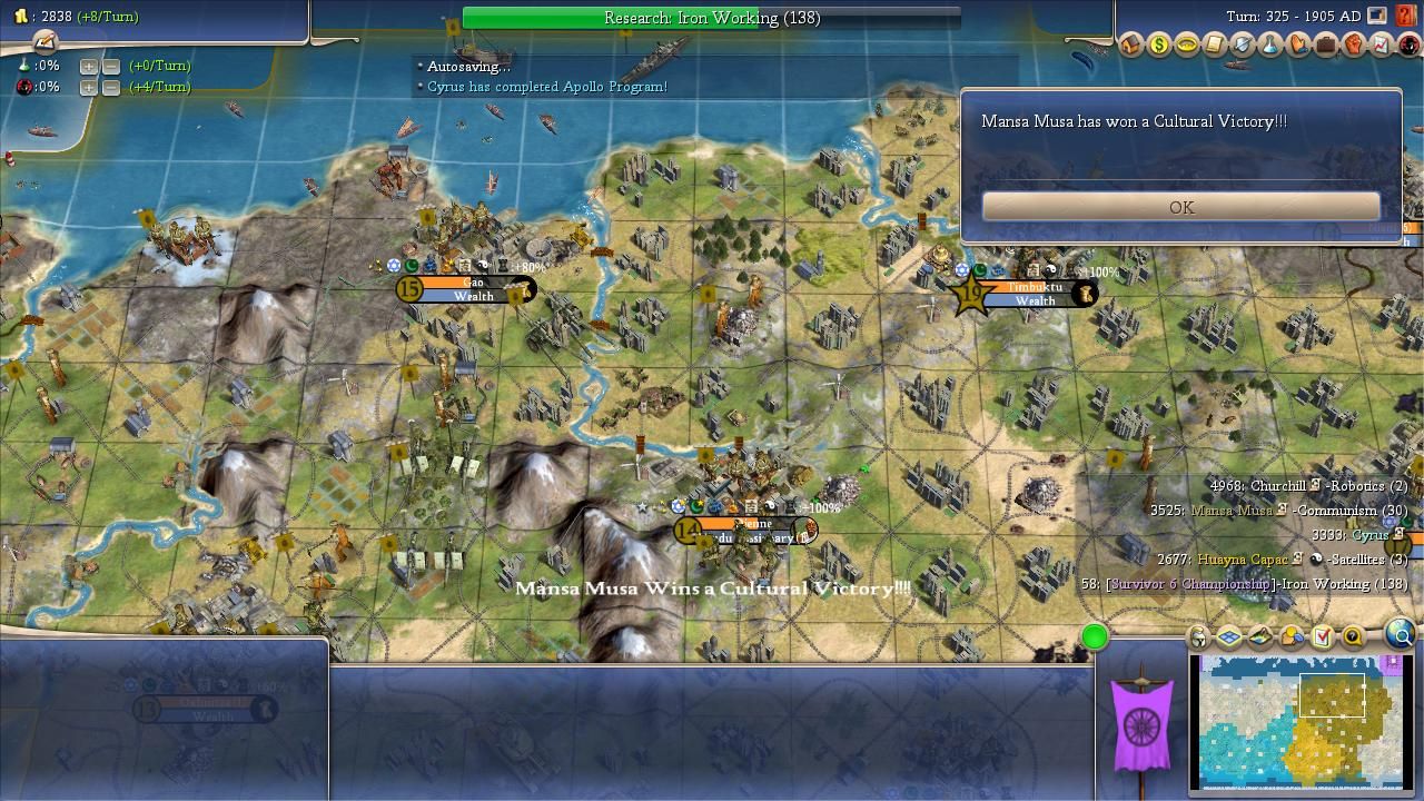 And with Pacal's elimination, the championship was basically wrapped up. Churchill had actually gotten out to a huge lead, over 1000 points ahead of all the other leaders on the scoreboard thanks to conquering most of two different rivals. He of all people would be the only leader to score kills in this game, and if it had continued to a Domination or Spaceship ending, he would surely have won. But the Churchill championship was not to be - he was still far away from an actual victory, and had bought Mansa the time he needed to finish off the Cultural win. Seven turns after Pacal's elimination, Mansa's third city hit Legendary, and that was that: