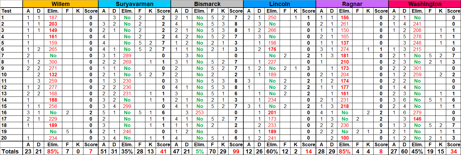 (Note : "A" column tracks the number of war declarations initiated by the AI, "D" the number of times the AI is declared upon, "F" the points for finish ranking, and "K" the number of kills.)