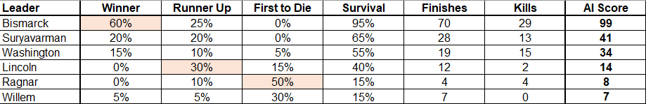 Wyatan did a fantastic job of putting together data for the Season Four games and I decided to use the same general format. First I'll post the resulting data and then discuss some of the findings in more detail. Keep in mind that everything we discuss in these alternate histories is map-specific: it pertains to these leaders with these starting positions in this game. As Wyatan mentioned, an AI leader could be a powerful figure on this particular map while still being a weak leader in more general terms. Now on to the results: