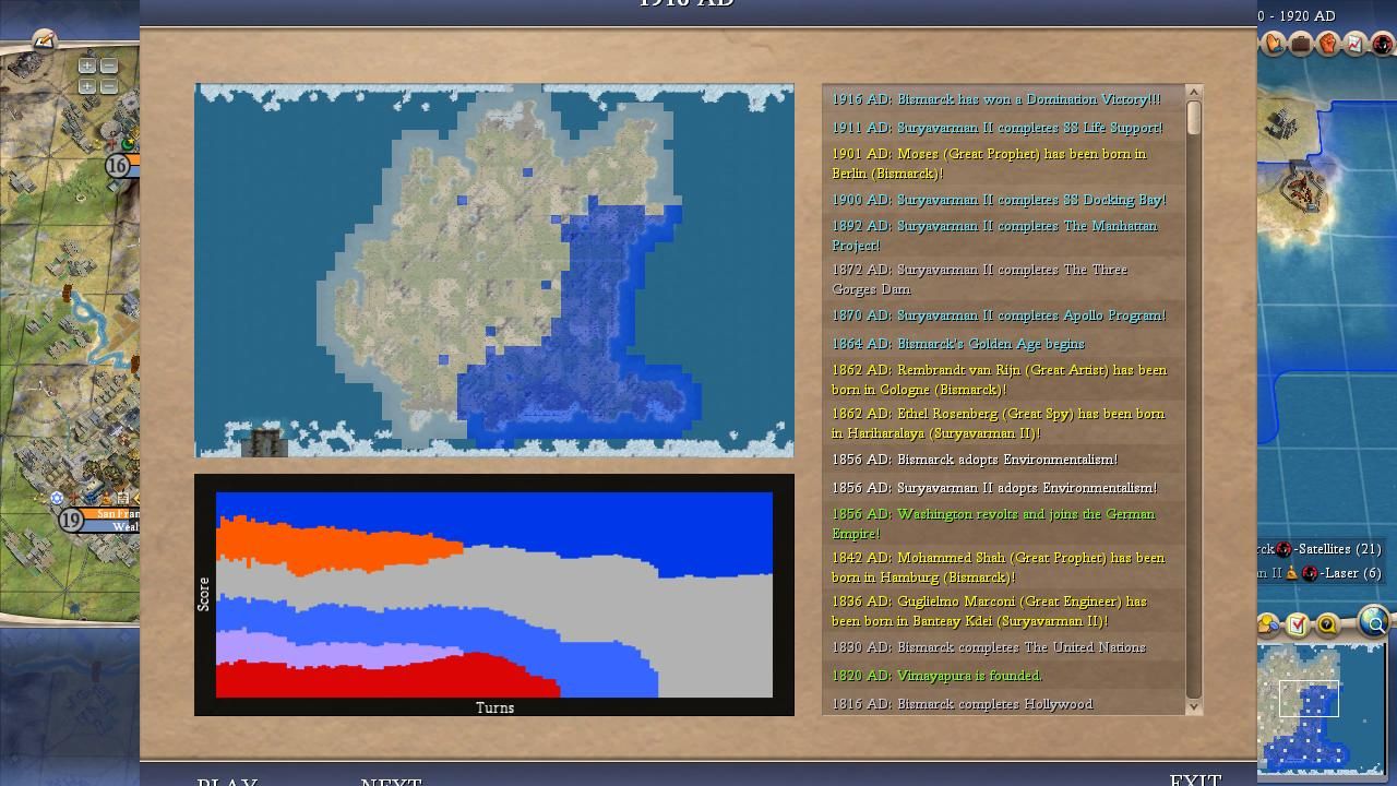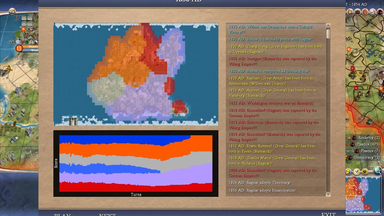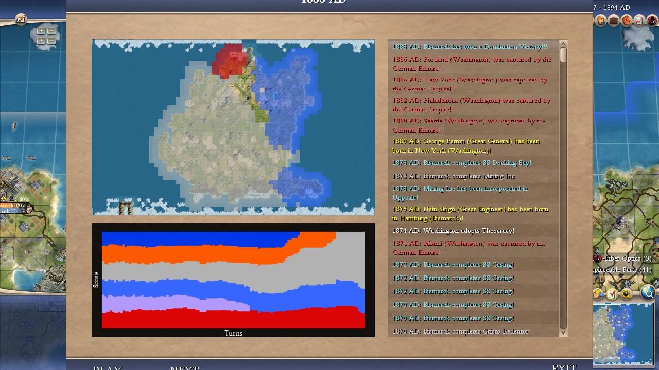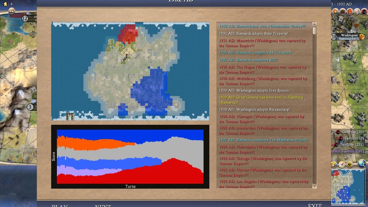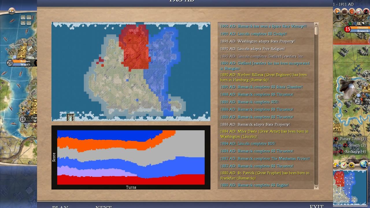 I covered most of the major points for Bismarck in the overall summary above. He was a true monster on this map and I was shocked at how he kept winning one Domination victory after another, even in games where his initial 100 turns were mediocre. It didn't seem to matter how the AI war declarations happened to shake out, it always felt as though Bismarck would find a path back to the top spot. Bismarck could have been even more successful than the numbers indicated here: he lost a SAME TURN victory tiebreaker to Washington in Game #18 when his spaceship landed on the same turn that the American leader triggered Domination. (Apparently the Domination victory gets precedent in Civ4's coding, likely due to alphabetical order in the victory conditions XML.) He basically had the teching performance that everyone expected Willem to enjoy and thanks to Bismack's sole tech flavor (MILITARY) he prioritized Rifling tech at an early date in every game. The best research rate in the field along with early rifles/cavs pretty much meant a curbstomping of a lot of medieval opponents. Bismarck seemed to find that sweet spot in these alternate histories between being overly passive like Pericles or Gandhi and being excessively militaristic like Ragnar or Montezuma. He also had the good luck to avoid getting targeted too often for invasions, facing only 21 defensive wars in total. Now this was heavily due to the fact that Bismarck was almost always very strong and the AI is less likely to attack neighbors who are much more powerful but it still helped in the early game. This wound up being the first game where everything truly came together for Bismarck and he showed what he could accomplish in the perfect scenario.