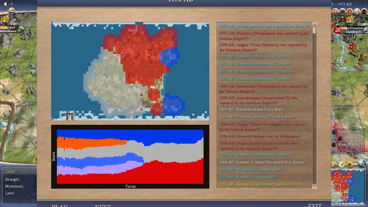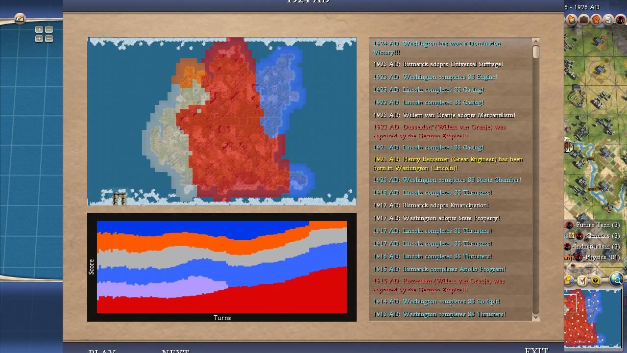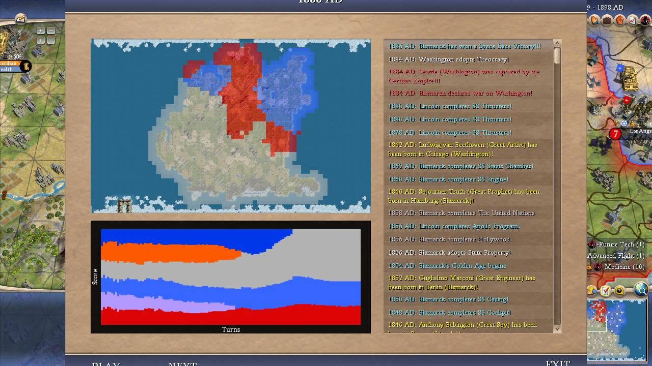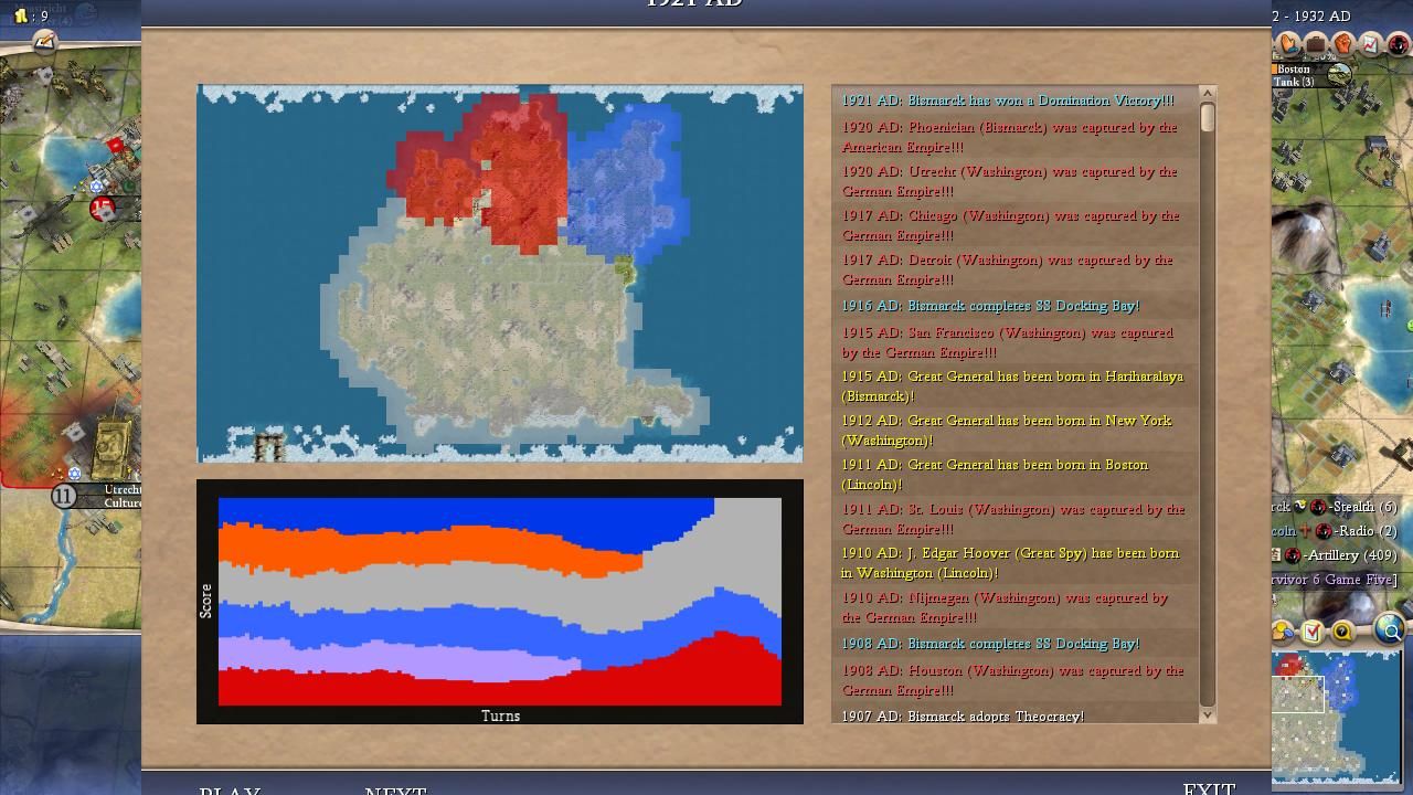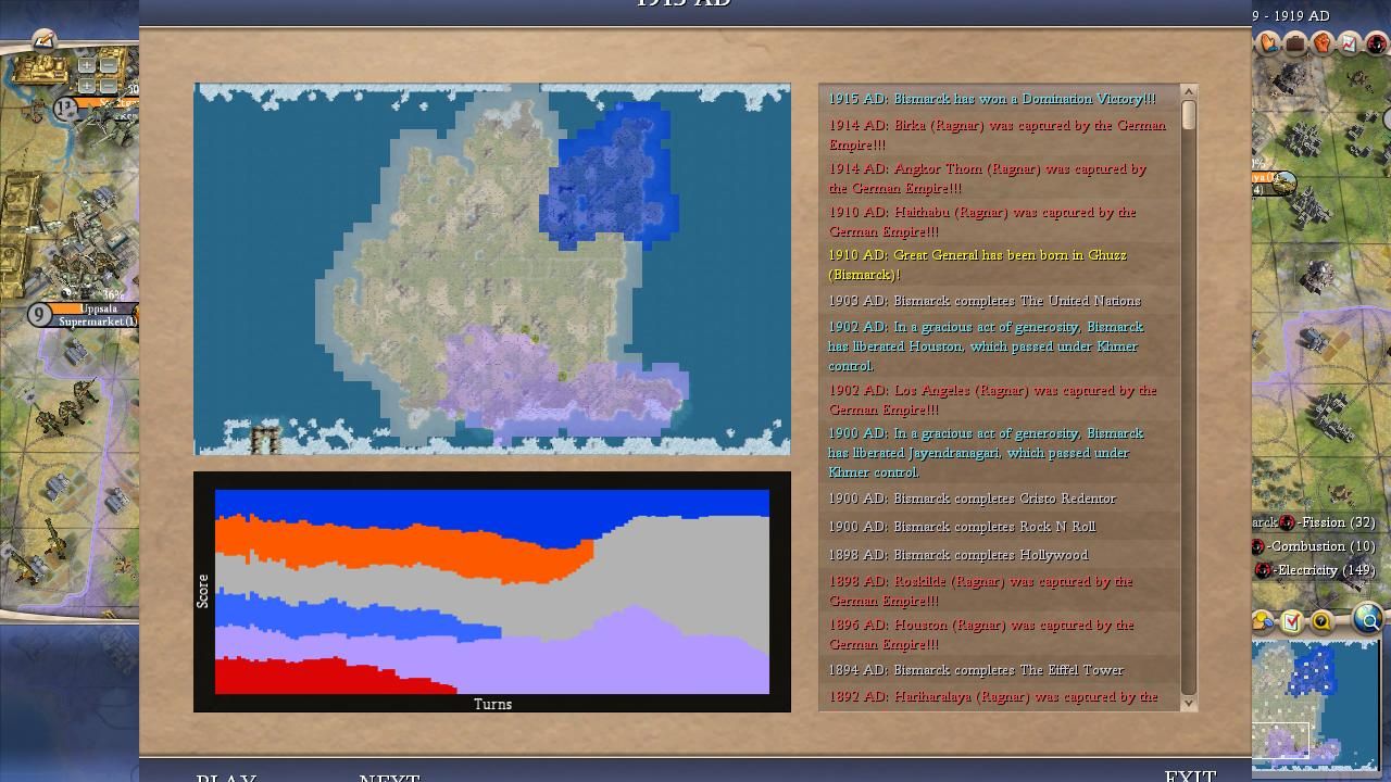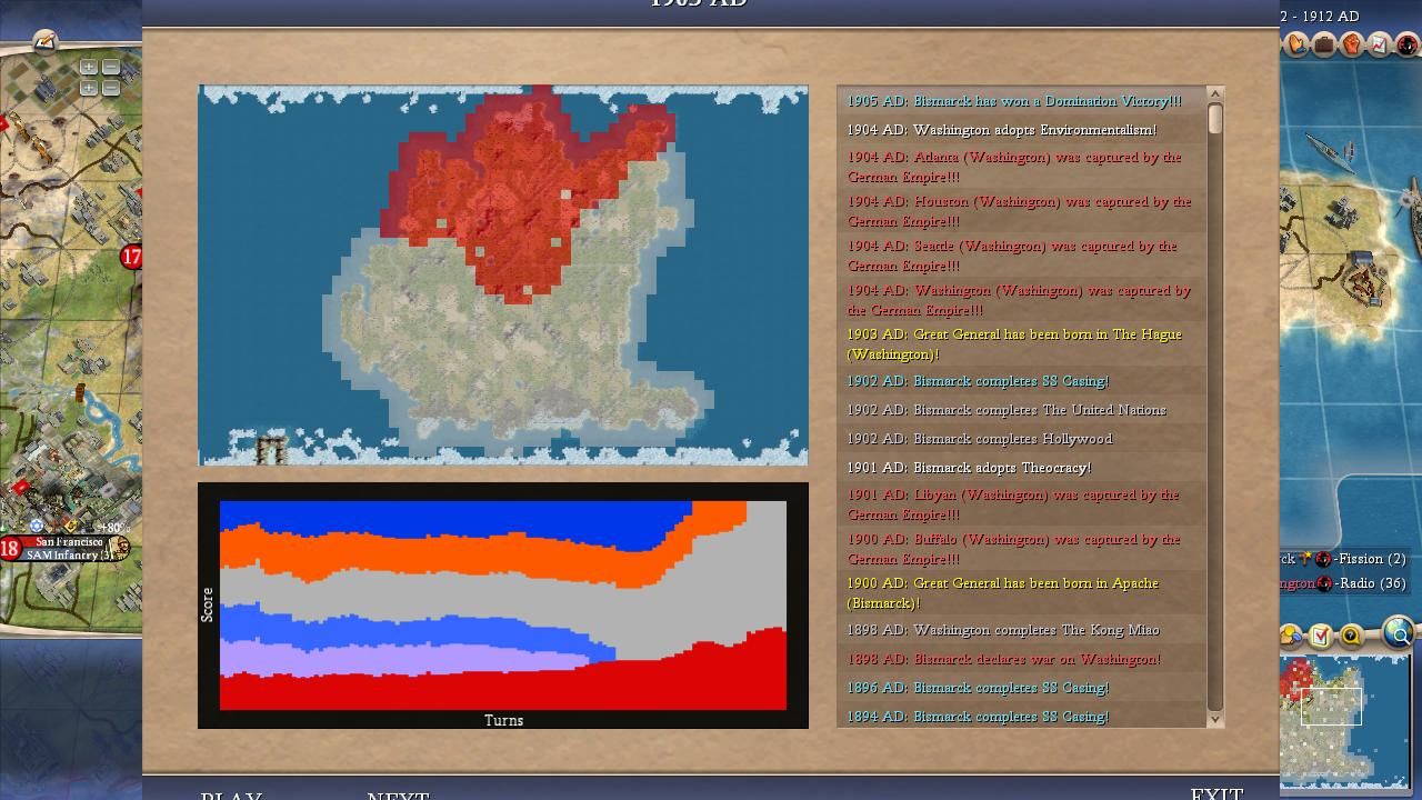 I covered most of the major points for Bismarck in the overall summary above. He was a true monster on this map and I was shocked at how he kept winning one Domination victory after another, even in games where his initial 100 turns were mediocre. It didn't seem to matter how the AI war declarations happened to shake out, it always felt as though Bismarck would find a path back to the top spot. Bismarck could have been even more successful than the numbers indicated here: he lost a SAME TURN victory tiebreaker to Washington in Game #18 when his spaceship landed on the same turn that the American leader triggered Domination. (Apparently the Domination victory gets precedent in Civ4's coding, likely due to alphabetical order in the victory conditions XML.) He basically had the teching performance that everyone expected Willem to enjoy and thanks to Bismack's sole tech flavor (MILITARY) he prioritized Rifling tech at an early date in every game. The best research rate in the field along with early rifles/cavs pretty much meant a curbstomping of a lot of medieval opponents. Bismarck seemed to find that sweet spot in these alternate histories between being overly passive like Pericles or Gandhi and being excessively militaristic like Ragnar or Montezuma. He also had the good luck to avoid getting targeted too often for invasions, facing only 21 defensive wars in total. Now this was heavily due to the fact that Bismarck was almost always very strong and the AI is less likely to attack neighbors who are much more powerful but it still helped in the early game. This wound up being the first game where everything truly came together for Bismarck and he showed what he could accomplish in the perfect scenario.