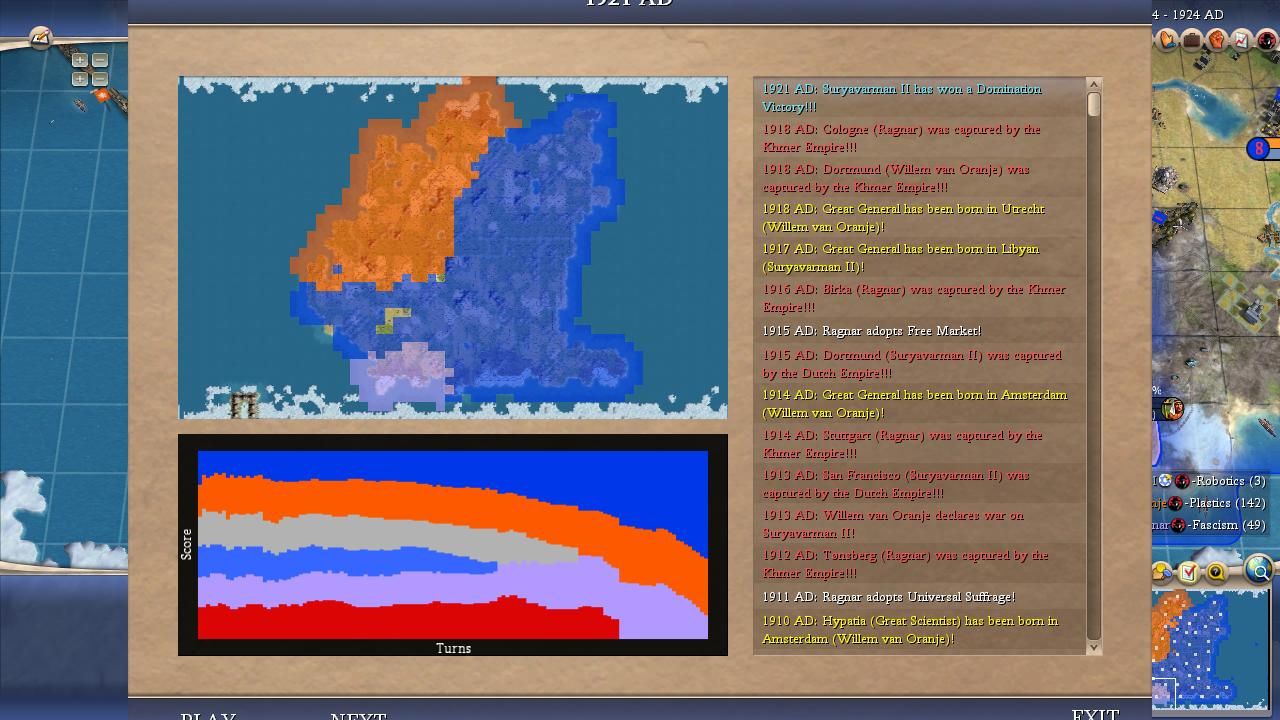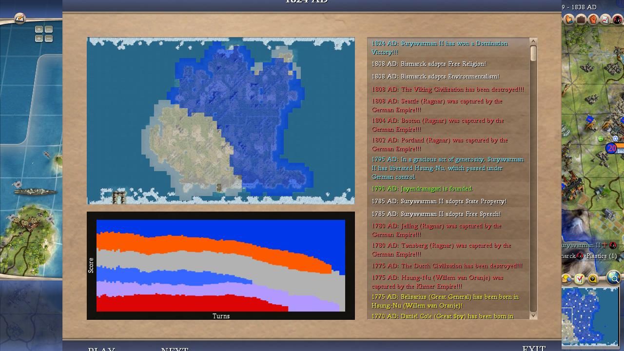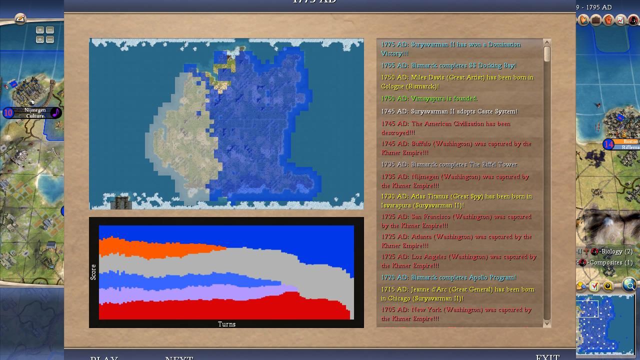 This was a terrible outing from Willem and most of the disastrous result was entirely due to his own AI personality. Willem is infamous for refusing to research the military techs needed to keep him safe (especially Rifling) and this self-destructive tendency was fully on display in the alternate histories. There were at least half a dozen games where he was ahead in tech and ahead in territory and still managed to die to Washington anyway in a 1 vs 1 conflict. That should never happen but it turned out to be readily possible when half the Dutch cities were permanently stuck on wonders or missionaries or some other nonsense. Although Willem had excellent land in his core he didn't expand particularly well and rarely managed to get more than five or six cities. We saw this in the Livestream game where he was doing too much wonder-building and that pattern was repeated time and again. Willem also wasn't helped in the religious realm either. He would usually found two or three religions and inevitably one of the minority faiths would spread to his neighbors to poison relations. Bismarck's gems resource also caused Germany to found its own religion in many games and that was similarly bad news, creating tension between Germany and the Dutch that overrode their shared peace weight. Peaceful coexistence is always in Willem's best interest but he almost never got it in the alternate histories - frequently due to his own stupidity! You might notice that Willem actually started more offensive wars than suffered defensive wars (23 to 21); he was often foolishly picking fights that he couldn't win rather than teching along in peace. There was exactly one game where Willem never fought a single war (Game #19), and sure enough, he won that match with a Cultural victory. Willem badly underachieved on this map with the flaws in his AI personality on full display.
