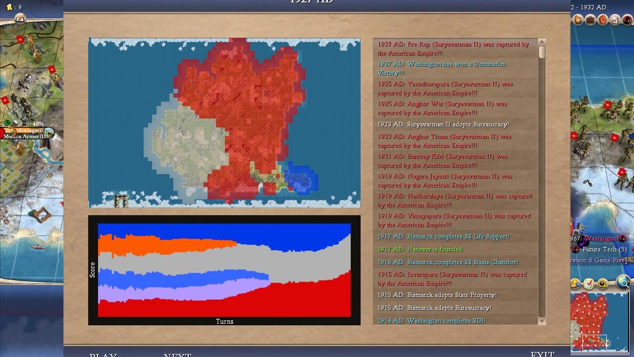 Suryavarman was also fortunate in having relatively weak neighbors to pick on. He had a great deal of success in conquering either Ragnar or Lincoln or both across many of the alternate histories. Unfortunately for Suryavarman, he also had many games where he stagnated for long periods of time against Lincoln, much as we watched in the actual Game Five on Livestream. Suryavarman's aggression against Lincoln also tended to bring in Washington as an additional opponent and frequently left him on the wrong side of 1 vs 2 conflicts. Suryavarman and Washington fought in significantly more total wars than any of the other AI leaders and the constant warfare helped to drag Suryavarman back to the pack in many of these games. He also tended to be a poor techer which was responsible for a number of defeats that really should have become victories based on the amount of territory under Khmer control. It wasn't a coincidence that all of Suryavarman's victories came by Domination since he usually lost out to someone else if the game in question came down to a tech race. Overall, I can't avoid the feeling that this was a somewhat underwhelming performance for Suryavarman given his starting position and a favorable diplomatic situation. Although he still had good results taken as a whole, I think that the top tier AI Survivor leaders would have won more frequently from his start.