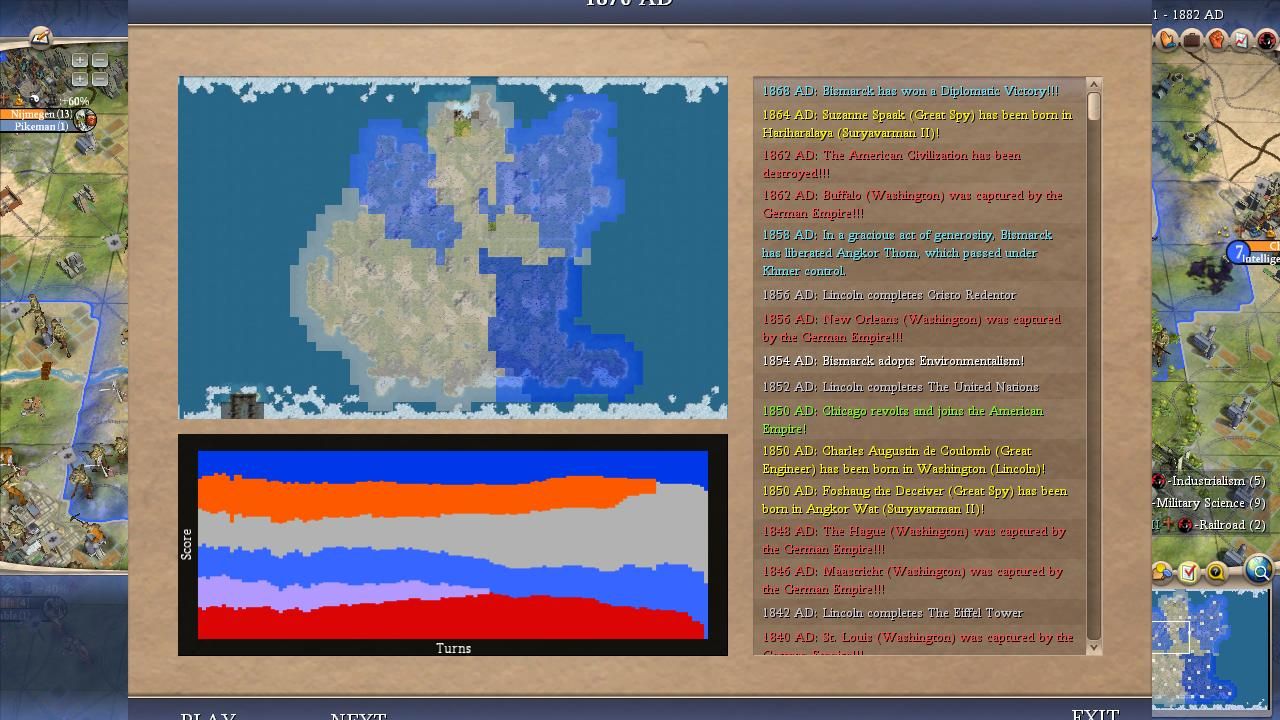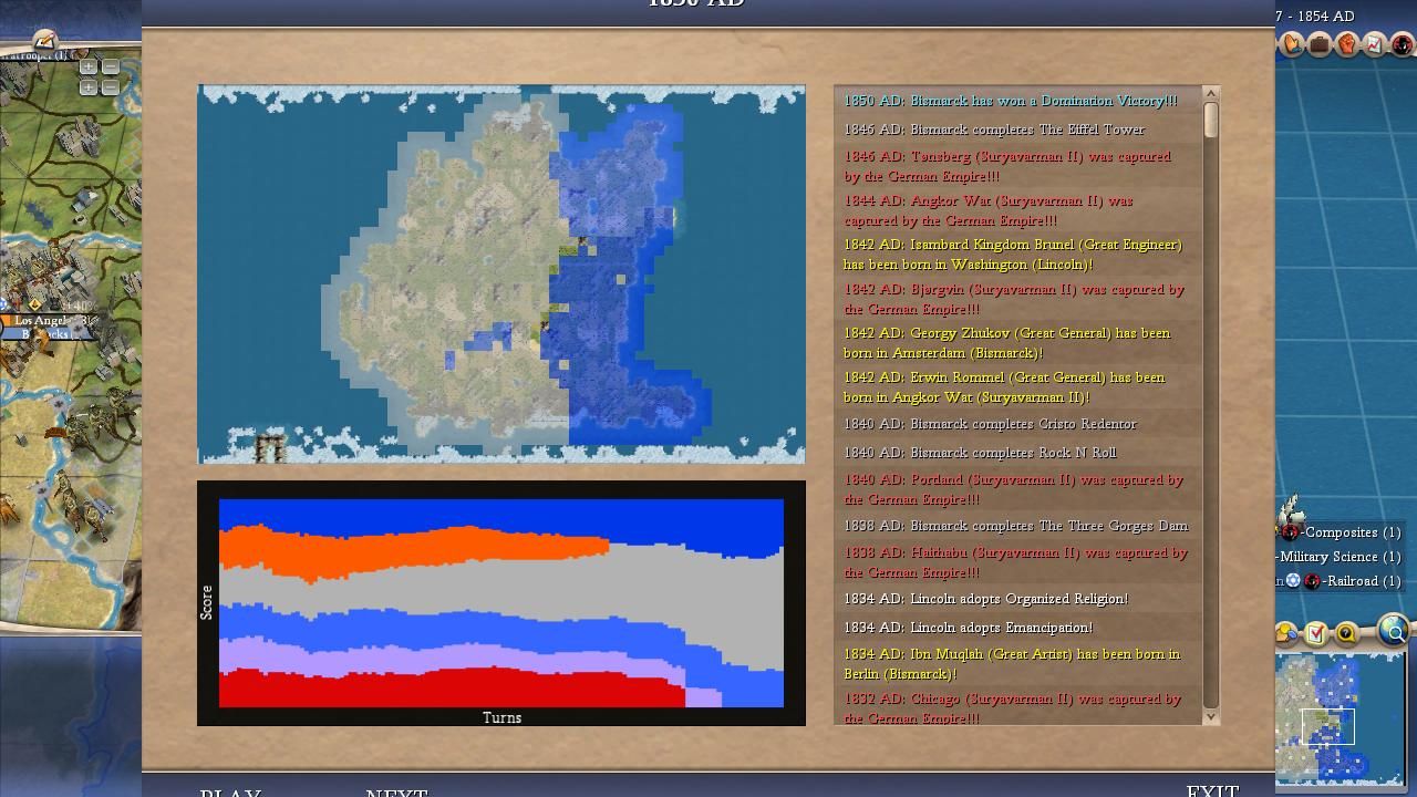There was a major dropoff from Washington to the other American leader who wound up with the fourth-most points. Whereas Washington was a reasonably strong AI leader who kept running afoul of poor diplomacy, Lincoln was a completely ineffective leader who did very little across the alternate histories. Lincoln fought the fewest total wars of anyone in the field, only 12 offensive and 26 defensive wars, and yet he still wound up getting eliminated 60% of the time. His paltry 2 kill were indicative of an inert leader who sat in the corner building and teching along without interacting with the rest of the world. It was highly apparent across these games how Washington's AI personality was significantly more aggressive than Lincoln's AI personality despite their similar peace weights. I think the best thing that I can say about Lincoln is that he teched pretty well for someone who rarely had much territory under his control. Lincoln just does not show up much in my notes because he was so passive in these games. As I mentioned above, his second place finishes were all backdoor results that mostly stemmed from Bismarck starting out on the extreme other side of the world. However, Lincoln was never in contention to win any of these matches, even the ones where he finished in second place. Take a look at the endgame screenshots at the top of this page, he was never close to the top leader in any of the alternate histories. This was a poor performance that lucked its way into some theoretical playoff berths due to dumb luck.