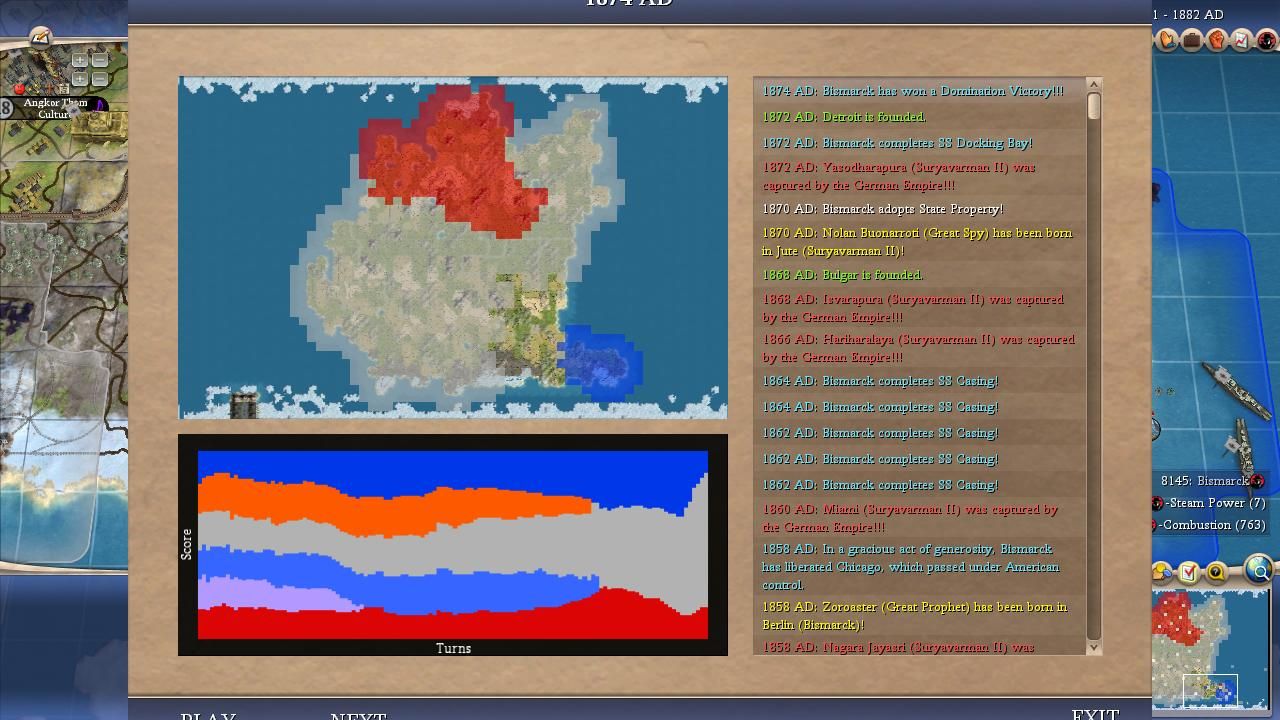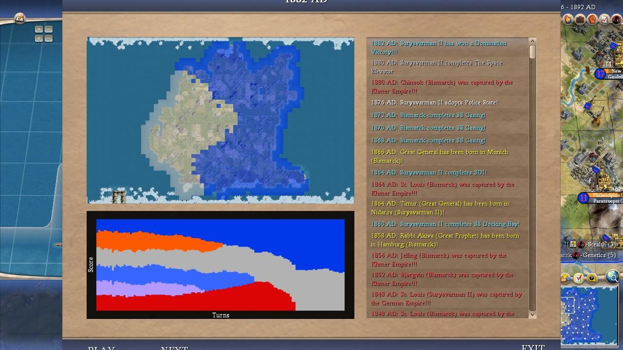 The other leader who drew a fair amount of community support in Game Five was Suryavarman. The Khmer leader ended up with a respectable second place scoring performance, taking home four victories and another four runner up finishes across the alternate histories. Suryavarman had the most isolated starting position on the map and appeared to have excellent opportunities for expansion through Ragnar and Lincoln. This did happen in some games and the best Khmer performances tended to take place in matches where Suryavarman was able to solo kill Lincoln and then keep rolling through the rest of the map. However, Suryavarman had a crippling weakness that prevented him from being more dominant: poor teching. Whether it was due to weaker economic traits or a lack of rivers in his territory, Suryavarman tended to fall far behind Bismarck in research and often lost lategame wars even when he had more cities under his control. There were several games where the two of them were close on the scoreboard but Bismarck was fielding tanks (panzers) against rifles/cavs for Suryavarman and we all know how poorly that goes for the AI.