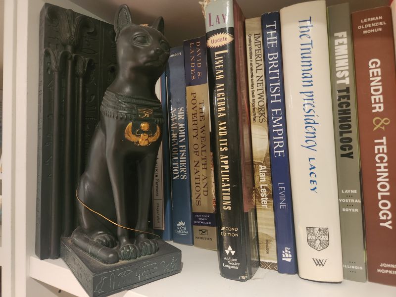 You might think that I would have grown sick of Civ4 by the end of the summer, however that was surprisingly not the case. I enjoyed Civ4's gameplay so much that it still remained fresh despite all these hours spent playing it. I was spending all day working on-site at Firaxis from 10 to 7, then driving home and grabbing a quick dinner just in time to take part in the Casual Wednesday and Big Game Night Multiplayer games that the Frankenstein group ran starting at 8, some of which lasted until well after midnight. I was eating, sleeping, and breathing Civ4 for months on end. It all had to come to an end eventually though, as university classes started up again at the end of August and I dropped back into the role of a mere online tester. Firaxis offered me a full-time job working with them as a permanent QA tester which I had to decline since I couldn't do that while also simultaneously being a Ph.D. student. I've never regretted that decision even though it certainly would have been a different career path from the one that I ended up taking. I spent the final six weeks before release doing my best to help resolve some final Single Player issues, then drove up to take part in the Civ4 launch party when the game released at the end of October. There was a Civilization trivia contest that night at the launch party and, uh, I won the grand prize which was a set of bookholders shaped like Egyptian cats. They still decorate the bookshelves in our house today: