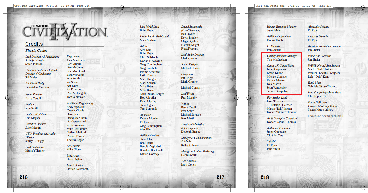 By the end of the summer, I had made enough of a name for myself that I was given access to the innermost sanctum of pre-release testing: the developer-only internal forum for Civ4. I had a direct pipeline to Soren and the other developers (including Civ5 developer Jon Shafer who I also met on-site) though I tried not to bother them unless something popped up that was truly urgent. The Firaxians trusted me enough to write a significant portion of the Civ4 manual and design the tech poster that shipped with the physical copy of the game, stuff that none of the other QA testers were trusted with. For the curious, I did get the chance to meet Sid Meier and shake his hand though he's largely been on the business side of Firaxis since it was created and had little direct involvement in creating Civ4. I spent more time interacting with his son, Ryan Meier, who was in high school at the time and sometimes dropped by the Firaxis offices to hang out with the QA team. Ryan Meier even joined us in the occasional Multiplayer game which means that I can say that yes, I attacked and killed Sid Meier's son in a game of Civ4 before it came out.