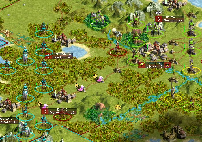 While that scuffle was going on to the east, my alliance with Spain granted me contact with one of the remaining AI leaders: John Curtin of Australia. The initial contact came when an Australian unit wandered past one of the Spanish cities, since I had shared vision with Philip for the moment. While I went ahead and sent a delegation to Canberra, Curtin disliked me from the start for... reasons, apparently. I get what the designers were trying to do with different levels of intelligence from espionage, but a screen like this always annoys me. Diplomacy should never take place in the dark, and the player should have the chance to know why an AI leader dislikes them. For the moment, I was stuck with guessing why this guy hated Sumeria so badly.
