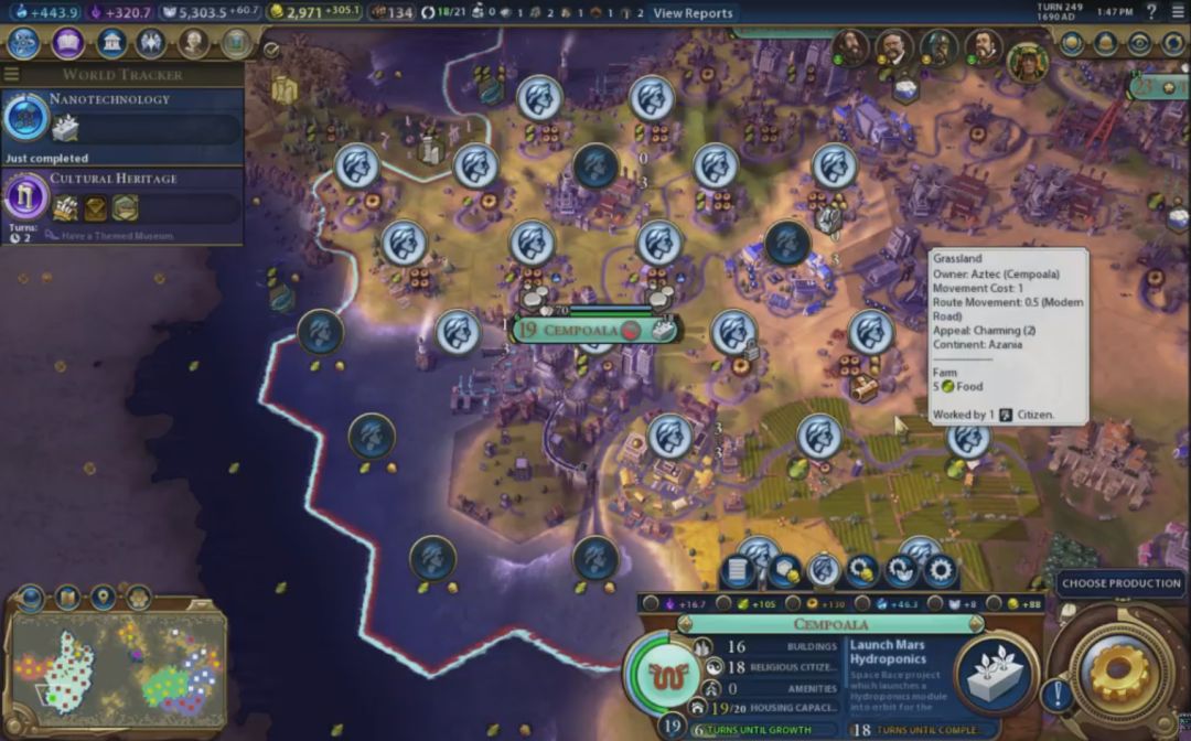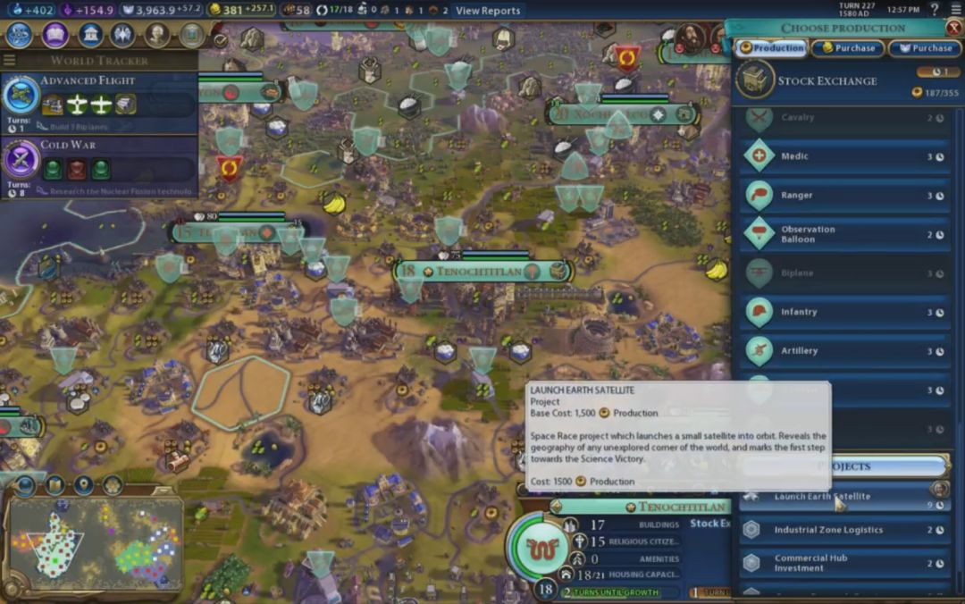 This city had nearly perfect terrain for a production powerhouse. The land to the north was all hill tiles, and I managed to place the Industrial district in a spot where all six of its adjacent tiles were mines. A perfect circle surrounding the district for the +6 adjacency bonus! I should have gotten some kind of extra bonus for that, heh. The southeast was then full of flatland terrain perfect for establishing farms, which could all buff one another with the Feudalism/Replaceable Parts bonus. The only issue is that as a coastal city in the deep south, Cempoala did not get the factory/power plant bonus production from too many of my other cities. Nevertheless, it was quite the city. I would have the capital build the first of the 3000 cost spaceship parts, Cempoala do the second part, and then the capital complete the third and final part.